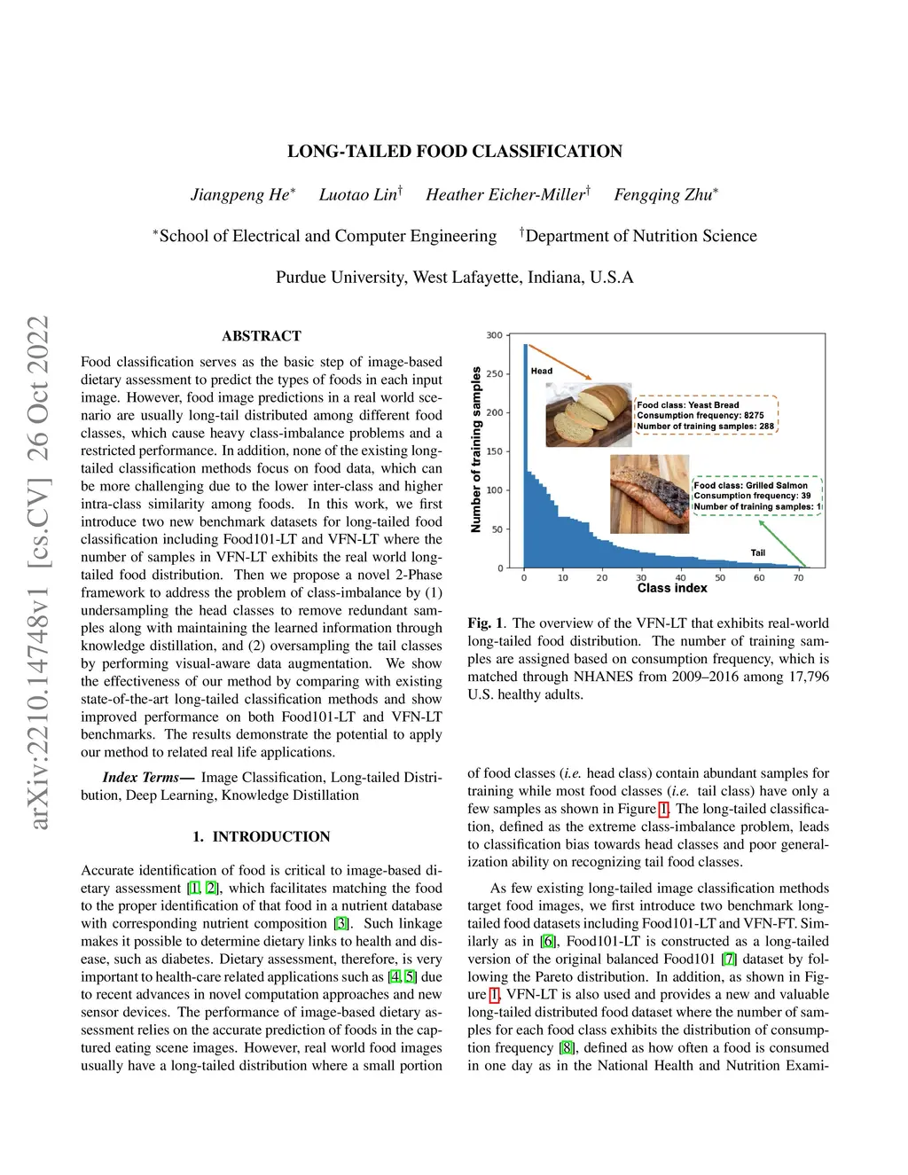 Food classification serves as the basic step of image-based dietary assessment to predict the types of foods in each input image. However, food image predictions in a real world scenario are usually long-tail distributed among different food classes, which cause heavy class-imbalance problems and a restricted performance. In addition, none of the existing long-tailed classification methods focus on food data, which can be more challenging due to the lower inter-class and higher intra-class similarity among foods. In this work, we first introduce two new benchmark datasets for long-tailed food classification including Food101-LT and VFN-LT where the number of samples in VFN-LT exhibits the real world long-tailed food distribution. Then we propose a novel 2-Phase framework to address the problem of class-imbalance by (1) undersampling the head classes to remove redundant samples along with maintaining the learned information through knowledge distillation, and (2) oversampling the tail classes by performing visual-aware data augmentation. We show the effectiveness of our method by comparing with existing state-of-the-art long-tailed classification methods and show improved performance on both Food101-LT and VFN-LT benchmarks. The results demonstrate the potential to apply our method to related real life applications.