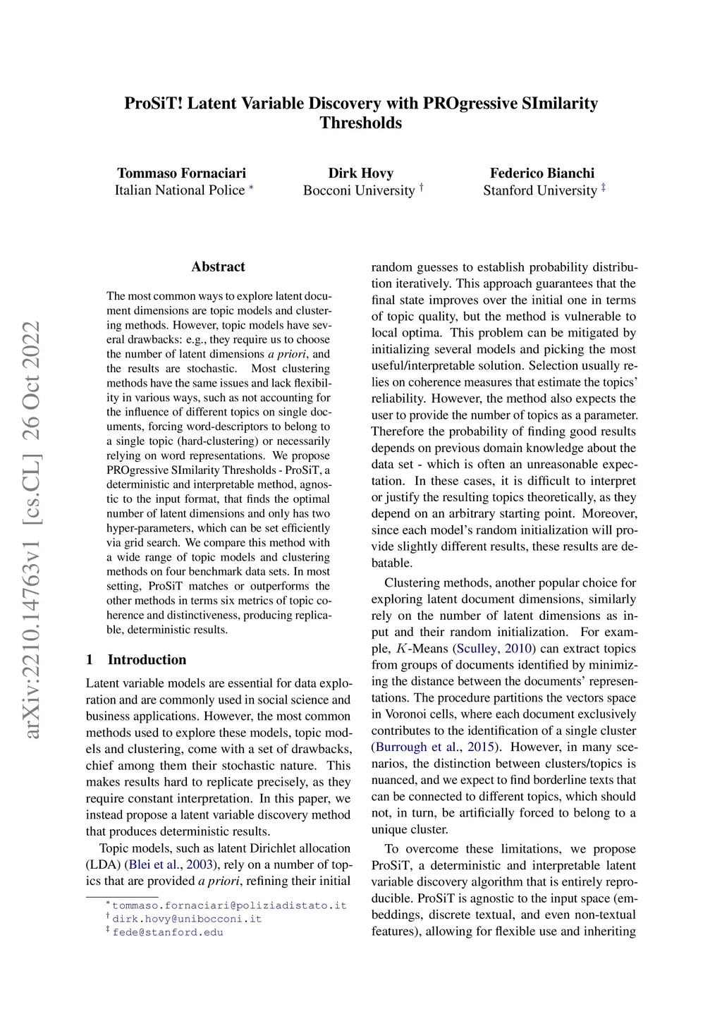 The most common ways to explore latent document dimensions are topic models and clustering methods. However, topic models have several drawbacks: e.g., they require us to choose the number of latent dimensions a priori, and the results are stochastic. Most clustering methods have the same issues and lack flexibility in various ways, such as not accounting for the influence of different topics on single documents, forcing word-descriptors to belong to a single topic (hard-clustering) or necessarily relying on word representations. We propose PROgressive SImilarity Thresholds - ProSiT, a deterministic and interpretable method, agnostic to the input format, that finds the optimal number of latent dimensions and only has two hyper-parameters, which can be set efficiently via grid search. We compare this method with a wide range of topic models and clustering methods on four benchmark data sets. In most setting, ProSiT matches or outperforms the other methods in terms six metrics of topic coherence and distinctiveness, producing replicable, deterministic results.