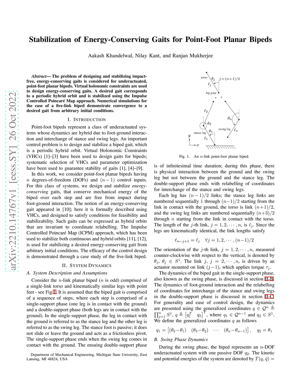 The problem of designing and stabilizing impact-free, energy-conserving gaits is considered for underactuated, point-foot planar bipeds. Virtual holonomic constraints are used to design energy-conserving gaits. A desired gait corresponds to a periodic hybrid orbit and is stabilized using the Impulse Controlled Poincar\é Map approach. Numerical simulations for the case of a five-link biped demonstrate convergence to a desired gait from arbitrary initial conditions.