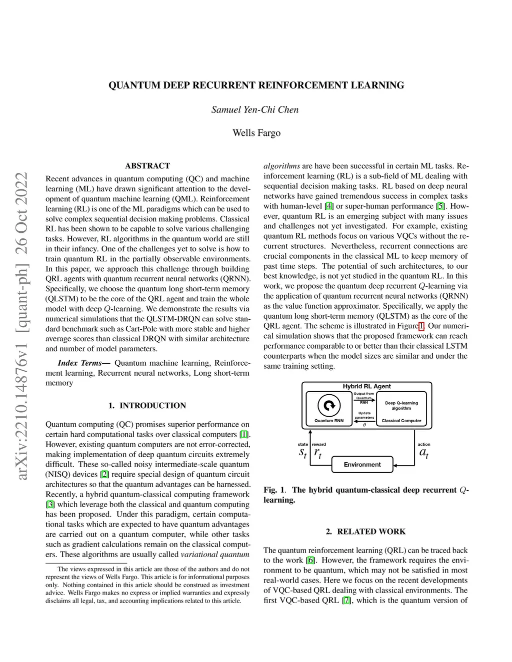 Recent advances in quantum computing (QC) and machine learning (ML) have drawn significant attention to the development of quantum machine learning (QML). Reinforcement learning (RL) is one of the ML paradigms which can be used to solve complex sequential decision making problems. Classical RL has been shown to be capable to solve various challenging tasks. However, RL algorithms in the quantum world are still in their infancy. One of the challenges yet to solve is how to train quantum RL in the partially observable environments. In this paper, we approach this challenge through building QRL agents with quantum recurrent neural networks (QRNN). Specifically, we choose the quantum long short-term memory (QLSTM) to be the core of the QRL agent and train the whole model with deep -learning. We demonstrate the results via numerical simulations that the QLSTM-DRQN can solve standard benchmark such as Cart-Pole with more stable and higher average scores than classical DRQN with similar architecture and number of model parameters.