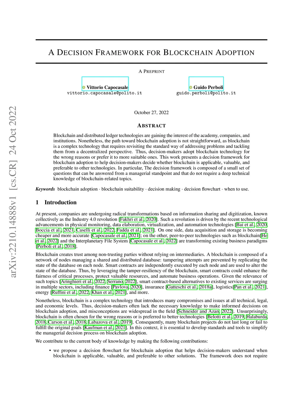 Blockchain and distributed ledger technologies are gaining the interest of the academy, companies, and institutions. Nonetheless, the path toward blockchain adoption is not straightforward, as blockchain is a complex technology that requires revisiting the standard way of addressing problems and tackling them from a decentralized perspective. Thus, decision-makers adopt blockchain technology for the wrong reasons or prefer it to more suitable ones. This work presents a decision framework for blockchain adoption to help decision-makers decide whether blockchain is applicable, valuable, and preferable to other technologies. In particular, The decision framework is composed of a small set of questions that can be answered from a managerial standpoint and that do not require a deep technical knowledge of blockchain-related topics.