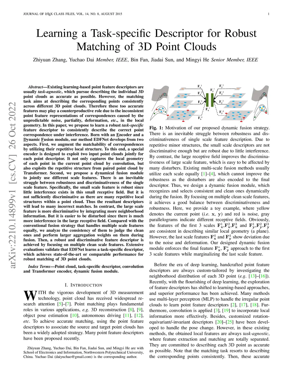Existing learning-based point feature descriptors are usually task-agnostic, which pursue describing the individual 3D point clouds as accurate as possible. However, the matching task aims at describing the corresponding points consistently across different 3D point clouds. Therefore these too accurate features may play a counterproductive role due to the inconsistent point feature representations of correspondences caused by the unpredictable noise, partiality, deformation, \etc, in the local geometry. In this paper, we propose to learn a robust task-specific feature descriptor to consistently describe the correct point correspondence under interference. Born with an Encoder and a Dynamic Fusion module, our method EDFNet develops from two aspects. First, we augment the matchability of correspondences by utilizing their repetitive local structure. To this end, a special encoder is designed to exploit two input point clouds jointly for each point descriptor. It not only captures the local geometry of each point in the current point cloud by convolution, but also exploits the repetitive structure from paired point cloud by Transformer. Second, we propose a dynamical fusion module to jointly use different scale features. There is an inevitable struggle between robustness and discriminativeness of the single scale feature. Specifically, the small scale feature is robust since little interference exists in this small receptive field. But it is not sufficiently discriminative as there are many repetitive local structures within a point cloud. Thus the resultant descriptors will lead to many incorrect matches. In contrast, the large scale feature is more discriminative by integrating more neighborhood information. ...