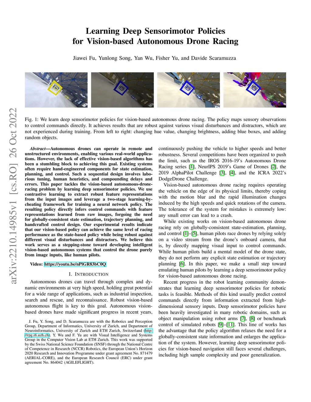 Autonomous drones can operate in remote and unstructured environments, enabling various real-world applications. However, the lack of effective vision-based algorithms has been a stumbling block to achieving this goal. Existing systems often require hand-engineered components for state estimation, planning, and control. Such a sequential design involves laborious tuning, human heuristics, and compounding delays and errors. This paper tackles the vision-based autonomous-drone-racing problem by learning deep sensorimotor policies. We use contrastive learning to extract robust feature representations from the input images and leverage a two-stage learning-by-cheating framework for training a neural network policy. The resulting policy directly infers control commands with feature representations learned from raw images, forgoing the need for globally-consistent state estimation, trajectory planning, and handcrafted control design. Our experimental results indicate that our vision-based policy can achieve the same level of racing performance as the state-based policy while being robust against different visual disturbances and distractors. We believe this work serves as a stepping-stone toward developing intelligent vision-based autonomous systems that control the drone purely from image inputs, like human pilots.