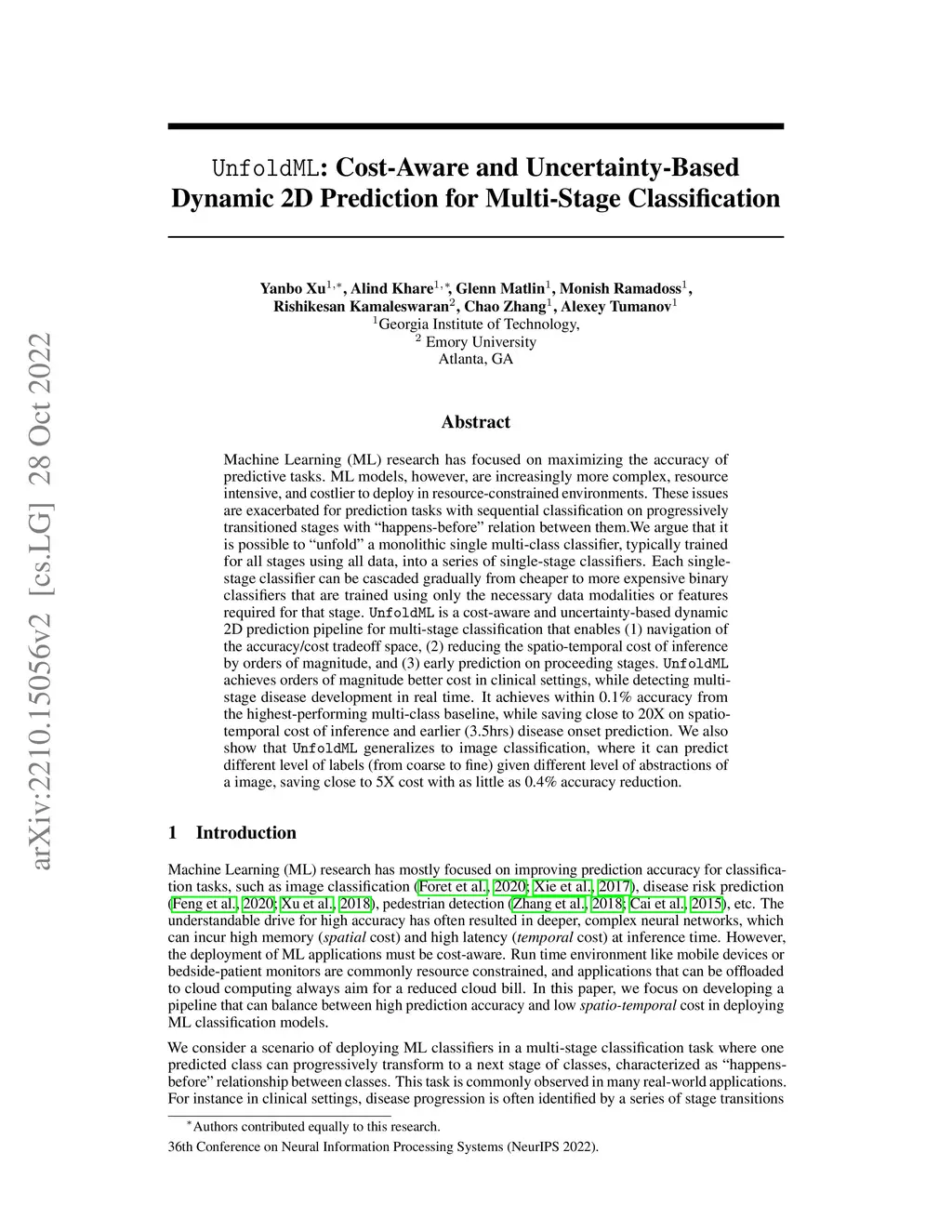 Machine Learning (ML) research has focused on maximizing the accuracy of predictive tasks. ML models, however, are increasingly more complex, resource intensive, and costlier to deploy in resource-constrained environments. These issues are exacerbated for prediction tasks with sequential classification on progressively transitioned stages with ''happens-before'' relation between them.We argue that it is possible to 'únfold'' a monolithic single multi-class classifier, typically trained for all stages using all data, into a series of single-stage classifiers. Each single-stage classifier can be cascaded gradually from cheaper to more expensive binary classifiers that are trained using only the necessary data modalities or features required for that stage. UnfoldML is a cost-aware and uncertainty-based dynamic 2D prediction pipeline for multi-stage classification that enables (1) navigation of the accuracy/cost tradeoff space, (2) reducing the spatio-temporal cost of inference by orders of magnitude, and (3) early prediction on proceeding stages. UnfoldML achieves orders of magnitude better cost in clinical settings, while detecting multi-stage disease development in real time. It achieves within 0.1% accuracy from the highest-performing multi-class baseline, while saving close to 20X on spatio-temporal cost of inference and earlier (3.5hrs) disease onset prediction. We also show that UnfoldML generalizes to image classification, where it can predict different level of labels (from coarse to fine) given different level of abstractions of a image, saving close to 5X cost with as little as 0.4% accuracy reduction.