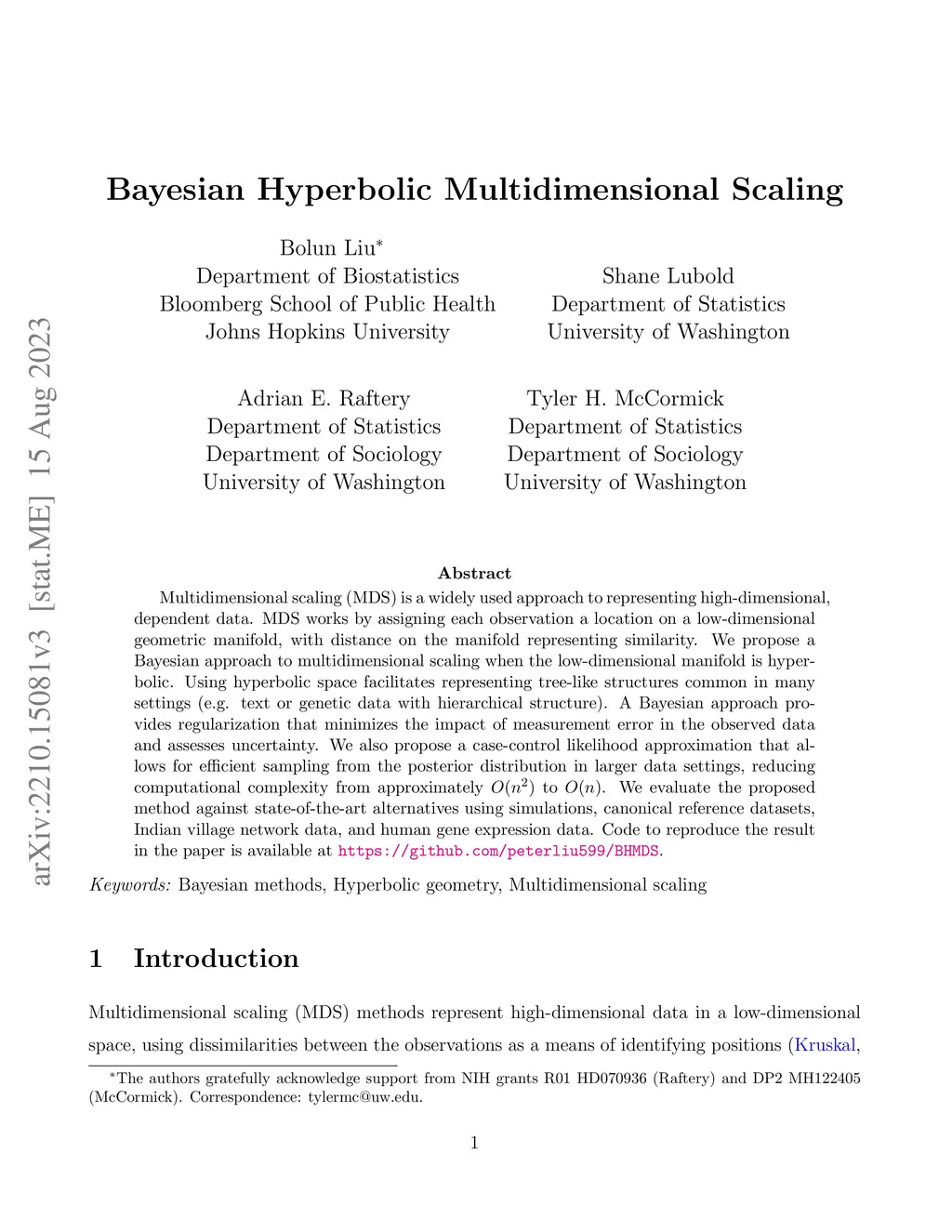 Multidimensional scaling (MDS) is a widely used approach to representing high-dimensional, dependent data. MDS works by assigning each observation a location on a low-dimensional geometric manifold, with distance on the manifold representing similarity. We propose a Bayesian approach to multidimensional scaling when the low-dimensional manifold is hyperbolic. Using hyperbolic space facilitates representing tree-like structure common in many settings (e.g. text or genetic data with hierarchical structure). A Bayesian approach provides regularization that minimizes the impact of uncertainty or measurement error in the observed data. We also propose a case-control likelihood approximation that allows for efficient sampling from the posterior in larger data settings, reducing computational complexity from approximately to . We evaluate the proposed method against state-of-the-art alternatives using simulations, canonical reference datasets, and human gene expression data.