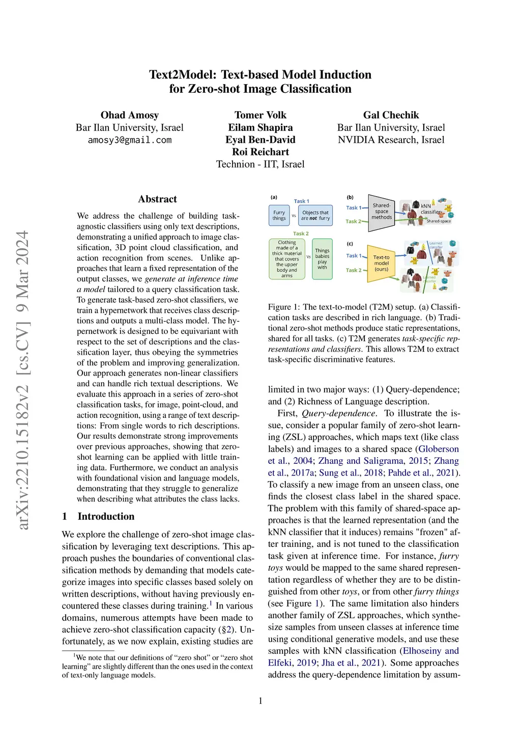 We address the challenge of building task-agnostic classifiers using only text descriptions, demonstrating a unified approach to image classification, 3D point cloud classification, and action recognition from scenes. Unlike approaches that learn a fixed representation of the output classes, we generate at inference time a model tailored to a query classification task. To generate task-based zero-shot classifiers, we train a hypernetwork that receives class descriptions and outputs a multi-class model. The hypernetwork is designed to be equivariant with respect to the set of descriptions and the classification layer, thus obeying the symmetries of the problem and improving generalization. Our approach generates non-linear classifiers and can handle rich textual descriptions. We evaluate this approach in a series of zero-shot classification tasks, for image, point-cloud, and action recognition, using a range of text descriptions: From single words to rich descriptions. Our results demonstrate strong improvements over previous approaches, showing that zero-shot learning can be applied with little training data. Furthermore, we conduct an analysis with foundational vision and language models, demonstrating that they struggle to generalize when describing what attributes the class lacks.