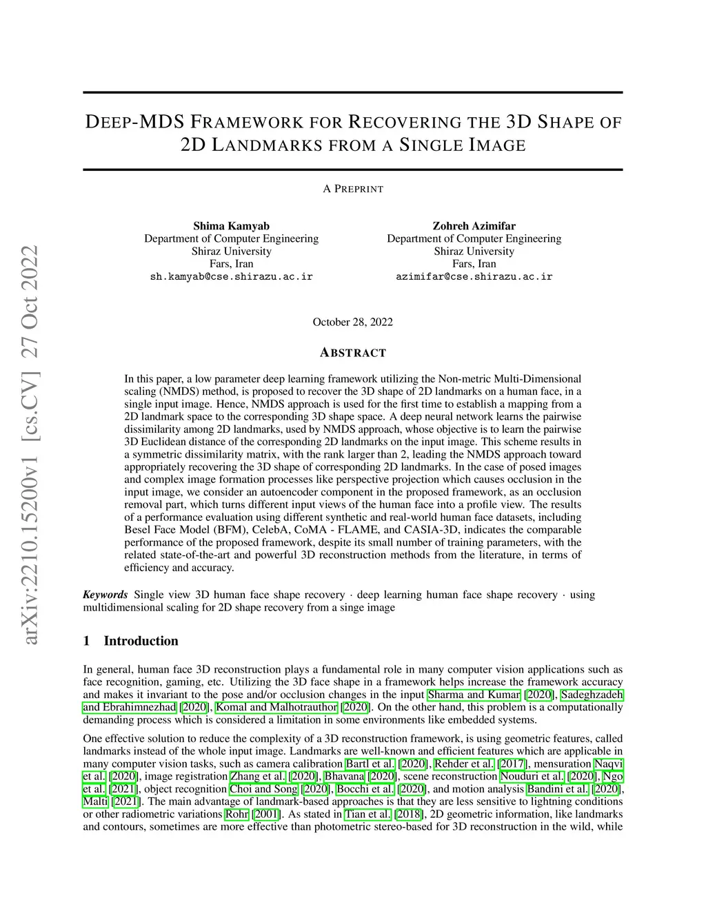 In this paper, a low parameter deep learning framework utilizing the Non-metric Multi-Dimensional scaling (NMDS) method, is proposed to recover the 3D shape of 2D landmarks on a human face, in a single input image. Hence, NMDS approach is used for the first time to establish a mapping from a 2D landmark space to the corresponding 3D shape space. A deep neural network learns the pairwise dissimilarity among 2D landmarks, used by NMDS approach, whose objective is to learn the pairwise 3D Euclidean distance of the corresponding 2D landmarks on the input image. This scheme results in a symmetric dissimilarity matrix, with the rank larger than 2, leading the NMDS approach toward appropriately recovering the 3D shape of corresponding 2D landmarks. In the case of posed images and complex image formation processes like perspective projection which causes occlusion in the input image, we consider an autoencoder component in the proposed framework, as an occlusion removal part, which turns different input views of the human face into a profile view. The results of a performance evaluation using different synthetic and real-world human face datasets, including Besel Face Model (BFM), CelebA, CoMA - FLAME, and CASIA-3D, indicates the comparable performance of the proposed framework, despite its small number of training parameters, with the related state-of-the-art and powerful 3D reconstruction methods from the literature, in terms of efficiency and accuracy.