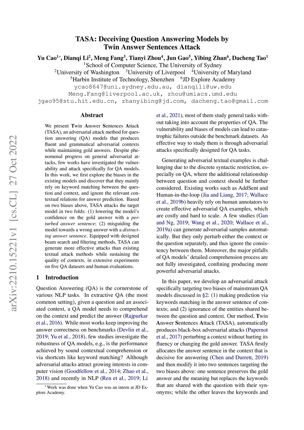 TASA: Deceiving Question Answering Models by Twin Answer Sentences
