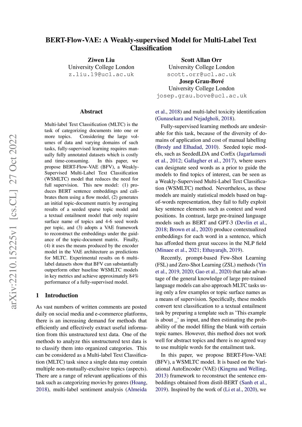 BERT-Flow-VAE: A Weakly-supervised Model for Multi-Label Text