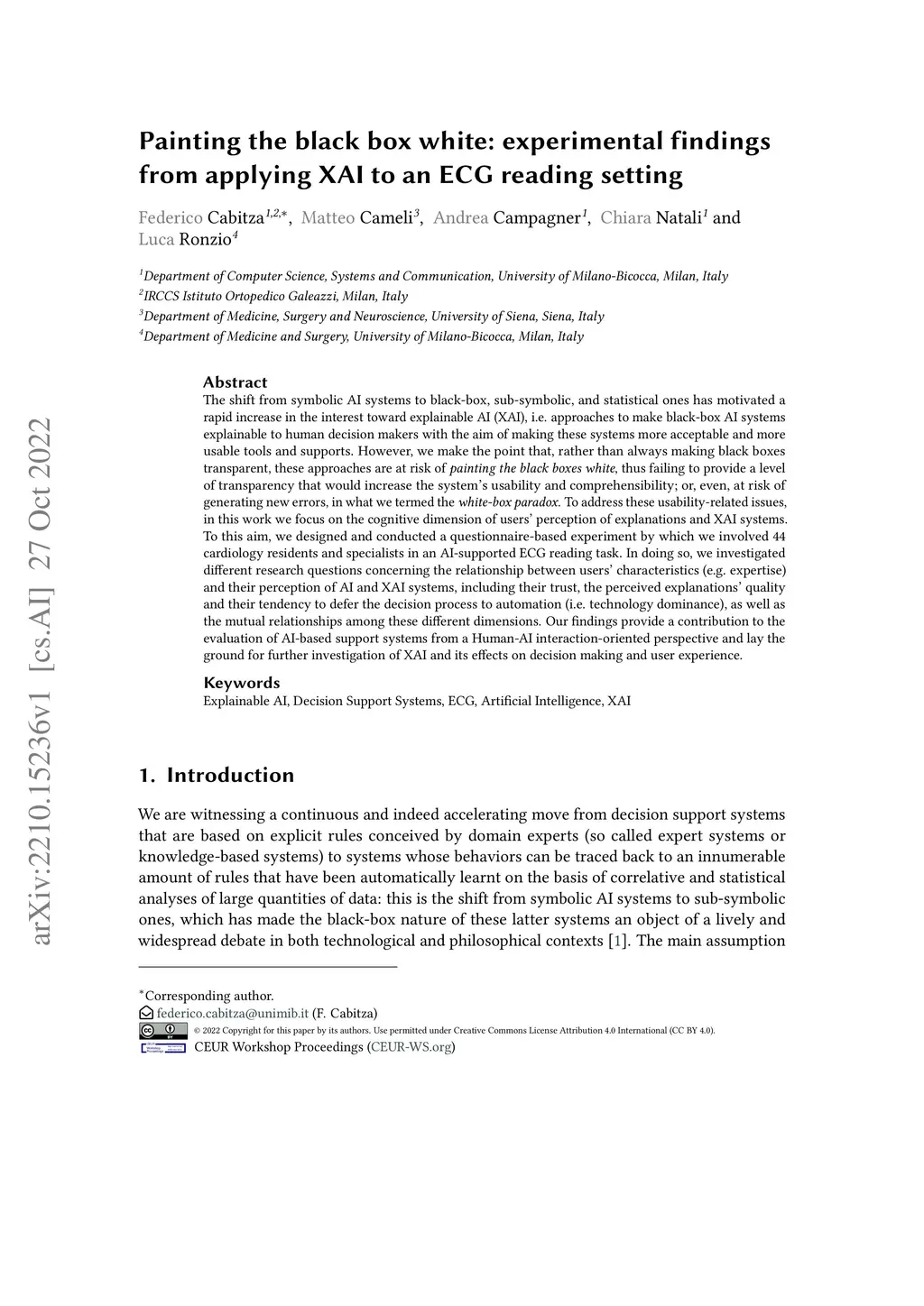 The shift from symbolic AI systems to black-box, sub-symbolic, and statistical ones has motivated a rapid increase in the interest toward explainable AI (XAI), i.e. approaches to make black-box AI systems explainable to human decision makers with the aim of making these systems more acceptable and more usable tools and supports. However, we make the point that, rather than always making black boxes transparent, these approaches are at risk of \emph{painting the black boxes white}, thus failing to provide a level of transparency that would increase the system's usability and comprehensibility; or, even, at risk of generating new errors, in what we termed the \emph{white-box paradox}. To address these usability-related issues, in this work we focus on the cognitive dimension of users' perception of explanations and XAI systems. To this aim, we designed and conducted a questionnaire-based experiment by which we involved 44 cardiology residents and specialists in an AI-supported ECG reading task. In doing so, we investigated different research questions concerning the relationship between users' characteristics (e.g. expertise) and their perception of AI and XAI systems, including their trust, the perceived explanations' quality and their tendency to defer the decision process to automation (i.e. technology dominance), as well as the mutual relationships among these different dimensions. Our findings provide a contribution to the evaluation of AI-based support systems from a Human-AI interaction-oriented perspective and lay the ground for further investigation of XAI and its effects on decision making and user experience.