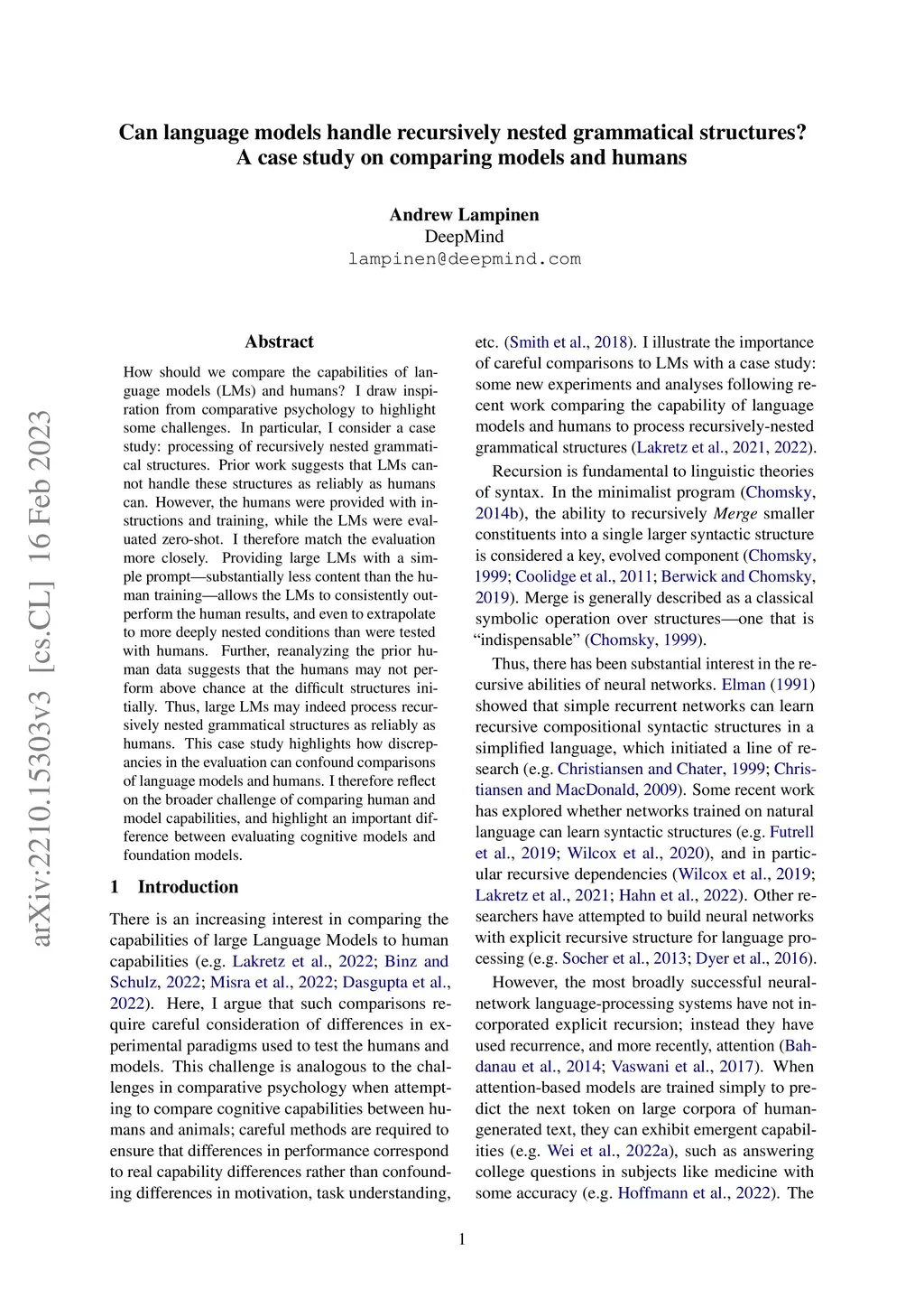 How should we compare the capabilities of language models (LMs) and humans? I draw inspiration from comparative psychology to highlight some challenges. In particular, I consider a case study: processing of recursively nested grammatical structures. Prior work suggests that LMs cannot handle these structures as reliably as humans can. However, the humans were provided with instructions and training, while the LMs were evaluated zero-shot. I therefore match the evaluation more closely. Providing large LMs with a simple prompt -- substantially less content than the human training -- allows the LMs to consistently outperform the human results, and even to extrapolate to more deeply nested conditions than were tested with humans. Further, reanalyzing the prior human data suggests that the humans may not perform above chance at the difficult structures initially. Thus, large LMs may indeed process recursively nested grammatical structures as reliably as humans. This case study highlights how discrepancies in the evaluation can confound comparisons of language models and humans. I therefore reflect on the broader challenge of comparing human and model capabilities, and highlight an important difference between evaluating cognitive models and foundation models.
