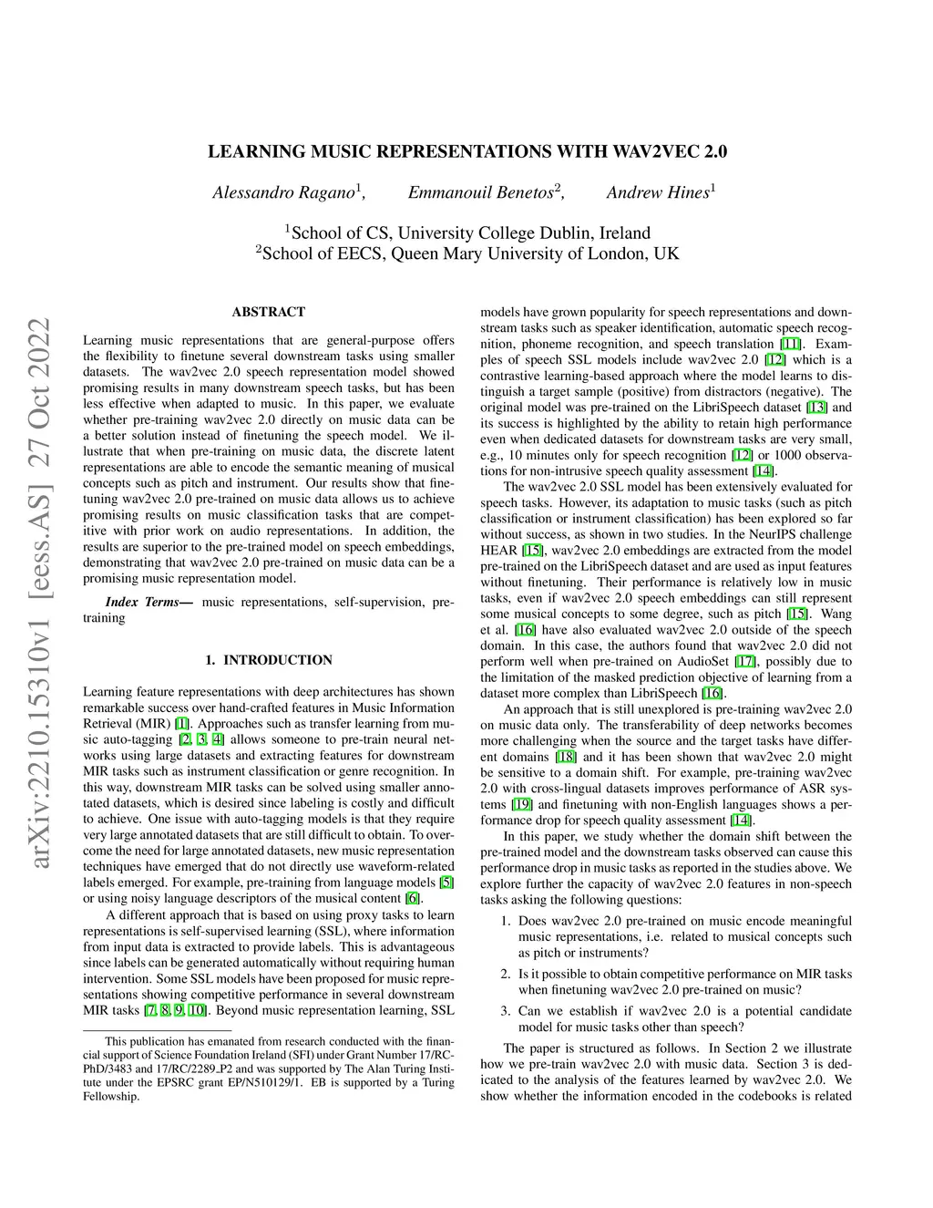 Learning music representations that are general-purpose offers the flexibility to finetune several downstream tasks using smaller datasets. The wav2vec 2.0 speech representation model showed promising results in many downstream speech tasks, but has been less effective when adapted to music. In this paper, we evaluate whether pre-training wav2vec 2.0 directly on music data can be a better solution instead of finetuning the speech model. We illustrate that when pre-training on music data, the discrete latent representations are able to encode the semantic meaning of musical concepts such as pitch and instrument. Our results show that finetuning wav2vec 2.0 pre-trained on music data allows us to achieve promising results on music classification tasks that are competitive with prior work on audio representations. In addition, the results are superior to the pre-trained model on speech embeddings, demonstrating that wav2vec 2.0 pre-trained on music data can be a promising music representation model.