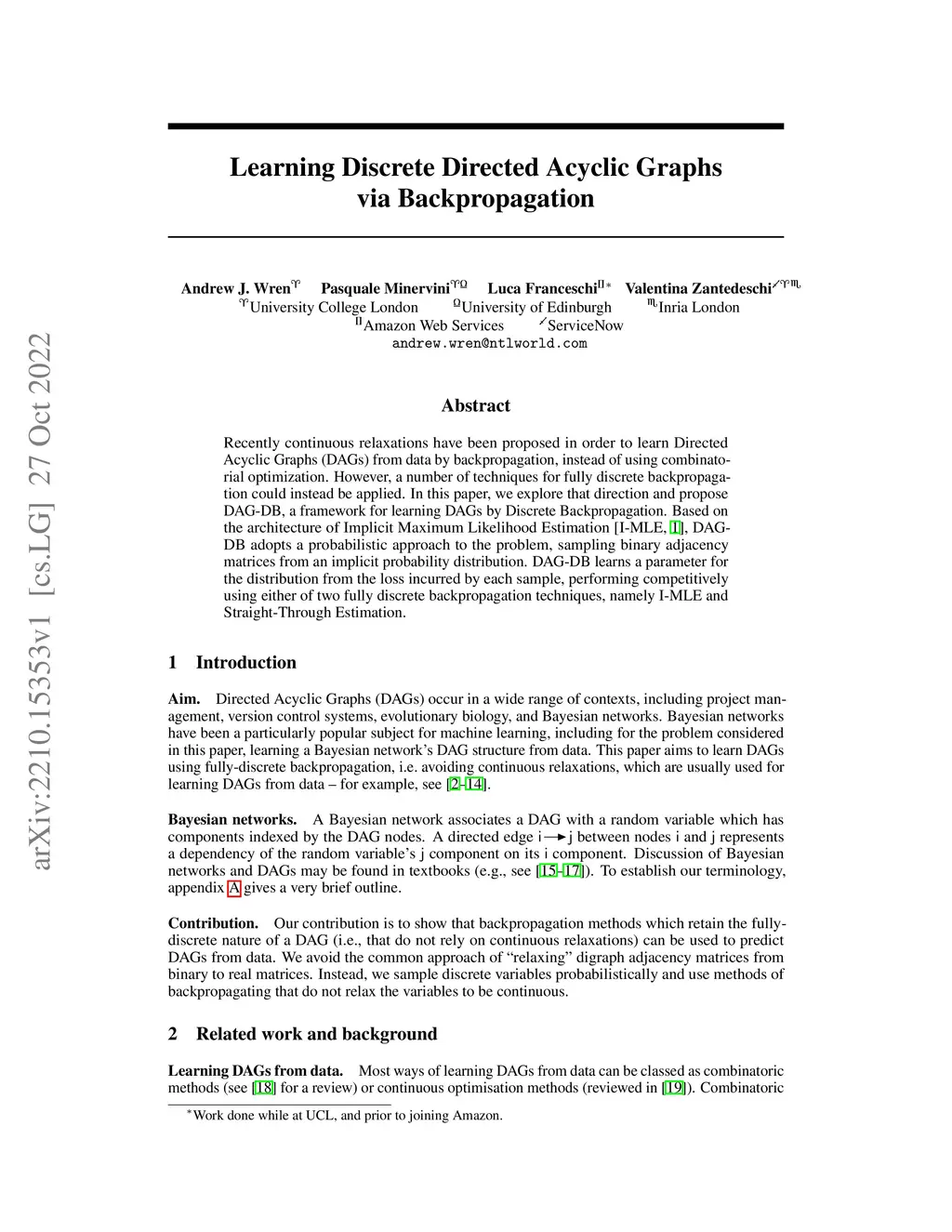 Learning Discrete Directed Acyclic Graphs via Backpropagation