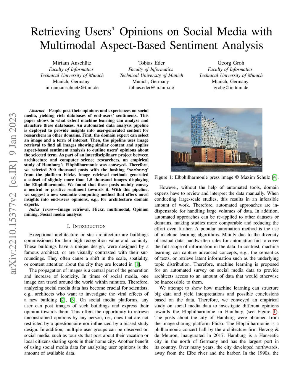 People post their opinions and experiences on social media, yielding rich databases of end-users' sentiments. This paper shows to what extent machine learning can analyze and structure these databases. An automated data analysis pipeline is deployed to provide insights into user-generated content for researchers in other domains. First, the domain expert can select an image and a term of interest. Then, the pipeline uses image retrieval to find all images showing similar content and applies aspect-based sentiment analysis to outline users' opinions about the selected term. As part of an interdisciplinary project between architecture and computer science researchers, an empirical study of Hamburg's Elbphilharmonie was conveyed. Therefore, we selected 300 thousand posts with the hashtag \enquote{\texttt{hamburg}} from the platform Flickr. Image retrieval methods generated a subset of slightly more than 1.5 thousand images displaying the Elbphilharmonie. We found that these posts mainly convey a neutral or positive sentiment towards it. With this pipeline, we suggest a new semantic computing method that offers novel insights into end-users opinions, e.g., for architecture domain experts.