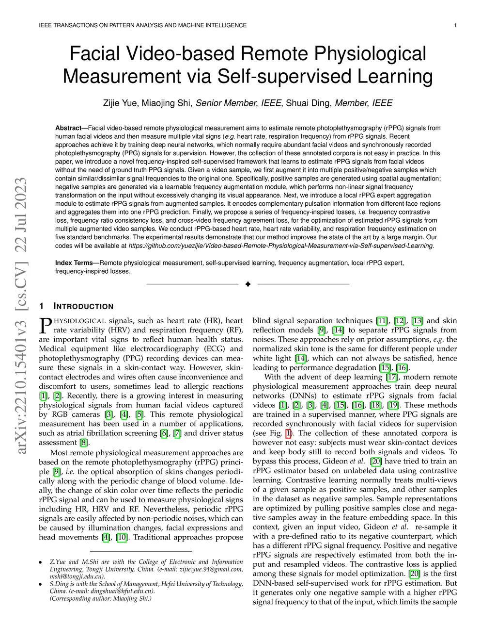 Facial Video-based Remote Physiological Measurement via Self-supervised