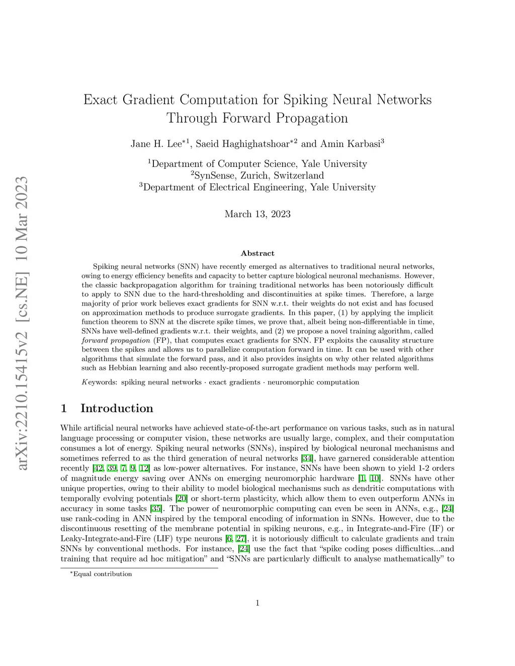 Spiking neural networks (SNN) have recently emerged as alternatives to traditional neural networks, owing to energy efficiency benefits and capacity to better capture biological neuronal mechanisms. However, the classic backpropagation algorithm for training traditional networks has been notoriously difficult to apply to SNN due to the hard-thresholding and discontinuities at spike times. Therefore, a large majority of prior work believes exact gradients for SNN w.r.t. their weights do not exist and has focused on approximation methods to produce surrogate gradients. In this paper, (1) by applying the implicit function theorem to SNN at the discrete spike times, we prove that, albeit being non-differentiable in time, SNNs have well-defined gradients w.r.t. their weights, and (2) we propose a novel training algorithm, called \emph{forward propagation} (FP), that computes exact gradients for SNN. FP exploits the causality structure between the spikes and allows us to parallelize computation forward in time. It can be used with other algorithms that simulate the forward pass, and it also provides insights on why other related algorithms such as Hebbian learning and also recently-proposed surrogate gradient methods may perform well.