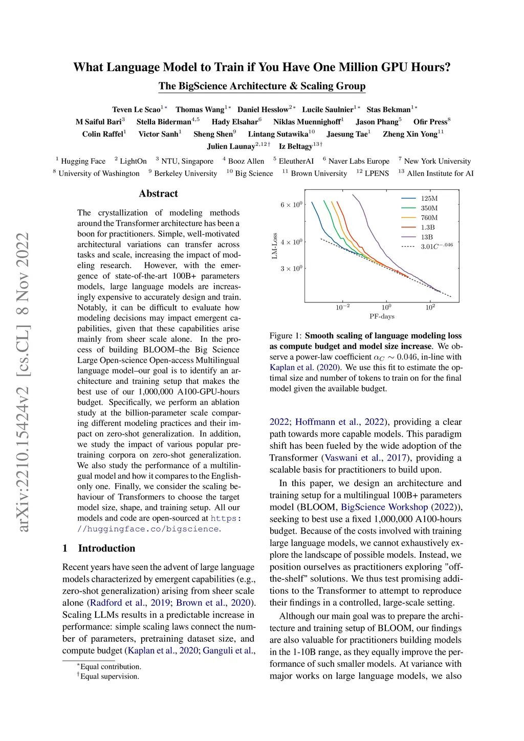 The crystallization of modeling methods around the Transformer architecture has been a boon for practitioners. Simple, well-motivated architectural variations can transfer across tasks and scale, increasing the impact of modeling research. However, with the emergence of state-of-the-art 100B+ parameters models, large language models are increasingly expensive to accurately design and train. Notably, it can be difficult to evaluate how modeling decisions may impact emergent capabilities, given that these capabilities arise mainly from sheer scale alone. In the process of building BLOOM--the Big Science Large Open-science Open-access Multilingual language model--our goal is to identify an architecture and training setup that makes the best use of our 1,000,000 A100-GPU-hours budget. Specifically, we perform an ablation study at the billion-parameter scale comparing different modeling practices and their impact on zero-shot generalization. In addition, we study the impact of various popular pre-training corpora on zero-shot generalization. We also study the performance of a multilingual model and how it compares to the English-only one. Finally, we consider the scaling behaviour of Transformers to choose the target model size, shape, and training setup. All our models and code are open-sourced at https://huggingface.co/bigscience .