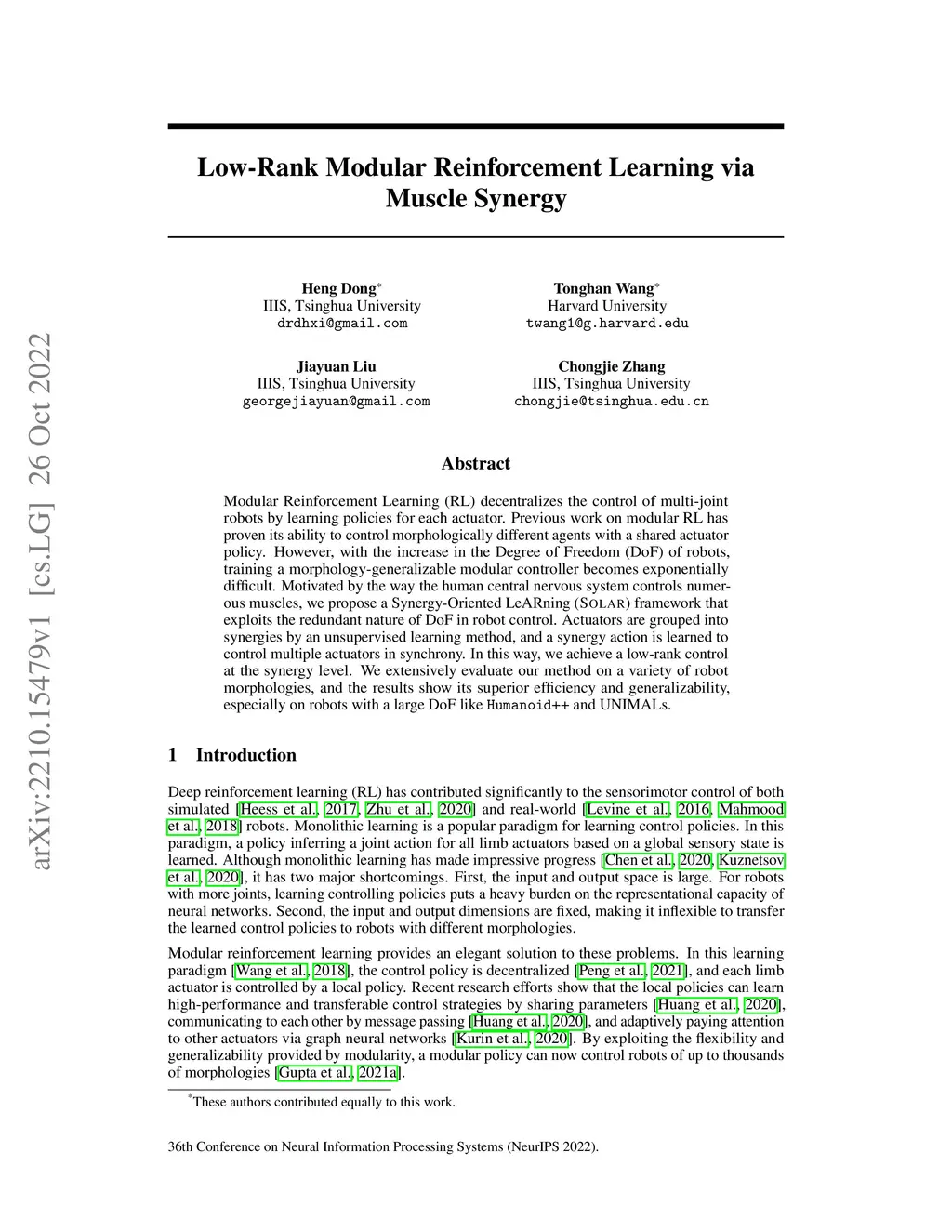 Modular Reinforcement Learning (RL) decentralizes the control of multi-joint robots by learning policies for each actuator. Previous work on modular RL has proven its ability to control morphologically different agents with a shared actuator policy. However, with the increase in the Degree of Freedom (DoF) of robots, training a morphology-generalizable modular controller becomes exponentially difficult. Motivated by the way the human central nervous system controls numerous muscles, we propose a Synergy-Oriented LeARning (SOLAR) framework that exploits the redundant nature of DoF in robot control. Actuators are grouped into synergies by an unsupervised learning method, and a synergy action is learned to control multiple actuators in synchrony. In this way, we achieve a low-rank control at the synergy level. We extensively evaluate our method on a variety of robot morphologies, and the results show its superior efficiency and generalizability, especially on robots with a large DoF like Humanoids++ and UNIMALs.