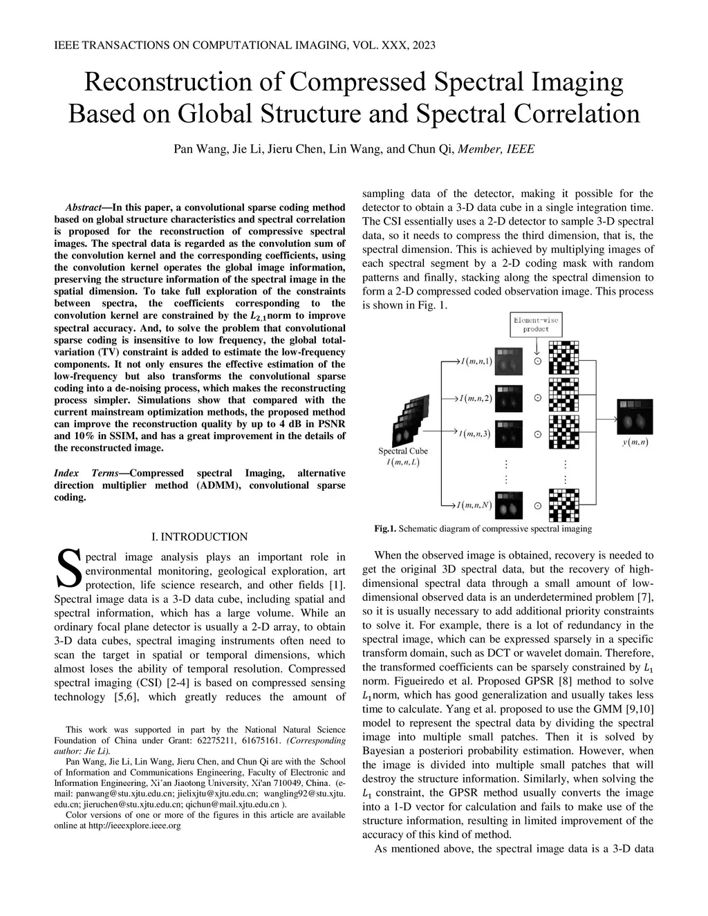 In this paper, a convolution sparse coding method based on global structure characteristics and spectral correlation is proposed for the reconstruction of compressive spectral images. The proposed method uses the convolution kernel to operate the global image, which can better preserve image structure information in the spatial dimension. To take full exploration of the constraints between spectra, the coefficients corresponding to the convolution kernel are constrained by the norm to improve spectral accuracy. And, to solve the problem that convolutional sparse coding is insensitive to low frequency, the global total-variation (TV) constraint is added to estimate the low-frequency components. It not only ensures the effective estimation of the low-frequency but also transforms the convolutional sparse coding into a de-noising process, which makes the reconstructing process simpler. Simulations show that compared with the current mainstream optimization methods (DeSCI and Gap-TV), the proposed method improves the reconstruction quality by up to 7 dB in PSNR and 10% in SSIM, and has a great improvement in the details of the reconstructed image.