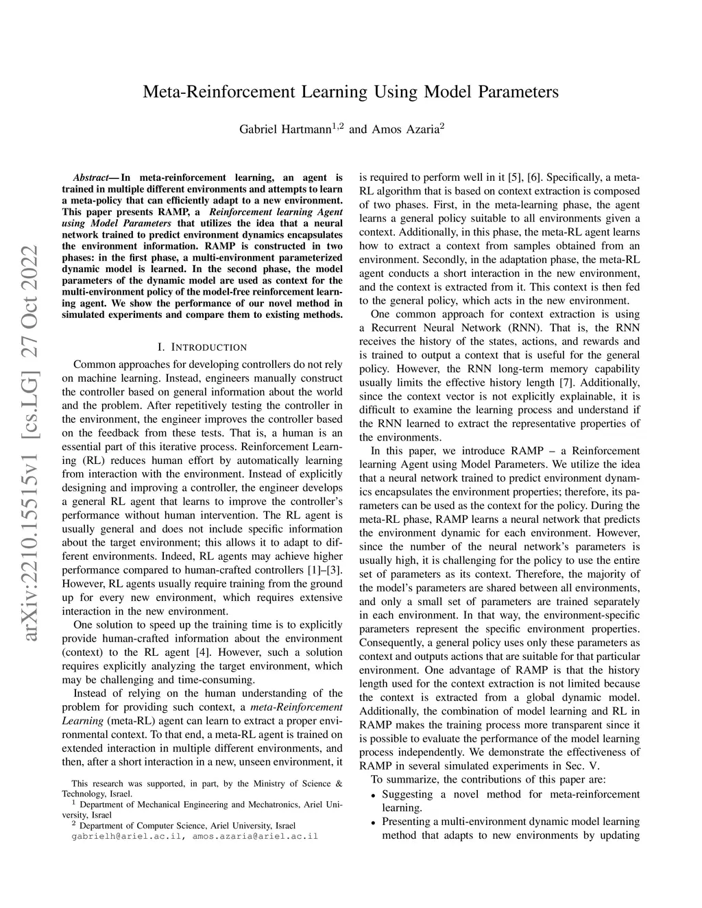 In meta-reinforcement learning, an agent is trained in multiple different environments and attempts to learn a meta-policy that can efficiently adapt to a new environment. This paper presents RAMP, a Reinforcement learning Agent using Model Parameters that utilizes the idea that a neural network trained to predict environment dynamics encapsulates the environment information. RAMP is constructed in two phases: in the first phase, a multi-environment parameterized dynamic model is learned. In the second phase, the model parameters of the dynamic model are used as context for the multi-environment policy of the model-free reinforcement learning agent.