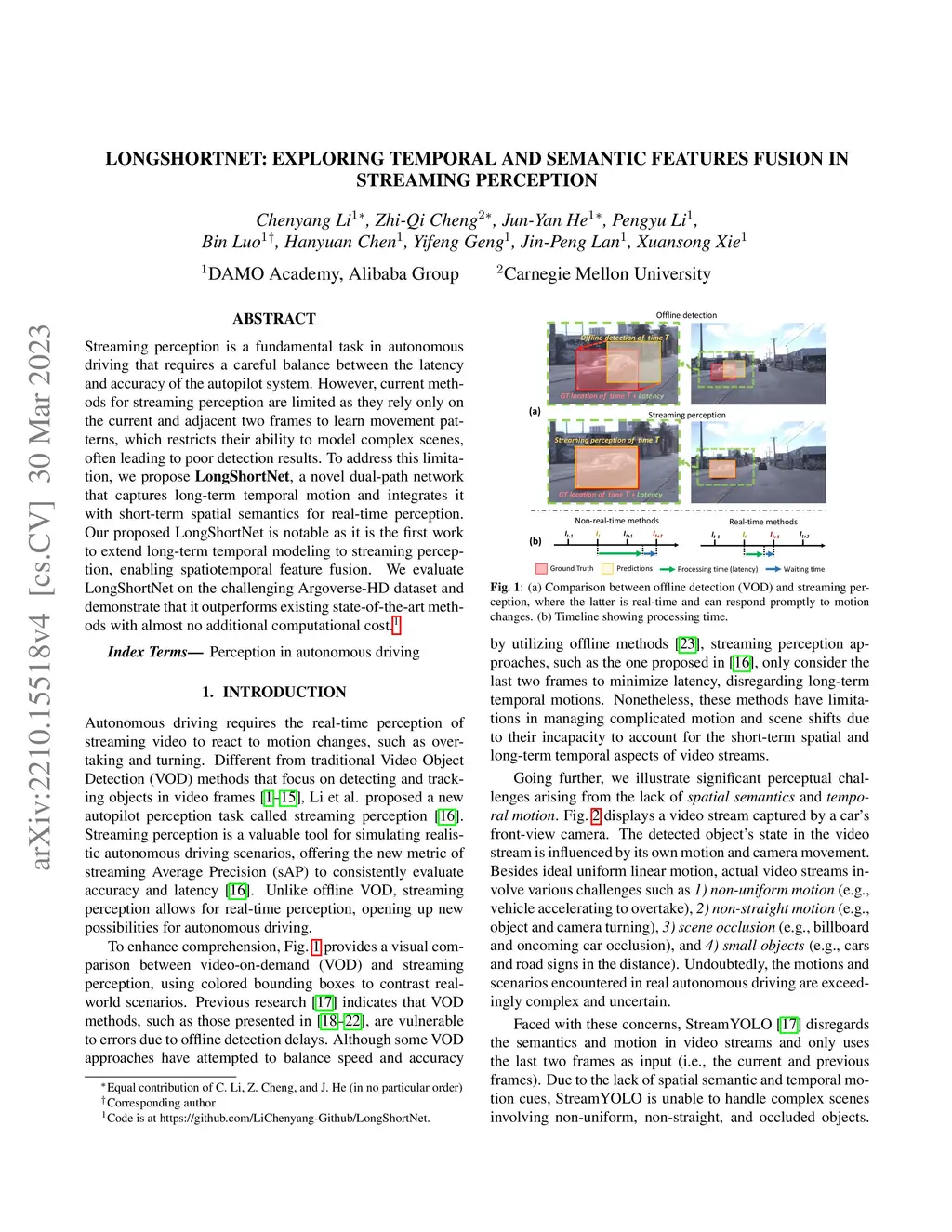 Streaming perception is a critical task in autonomous driving that requires balancing the latency and accuracy of the autopilot system. However, current methods for streaming perception are limited as they only rely on the current and adjacent two frames to learn movement patterns. This restricts their ability to model complex scenes, often resulting in poor detection results. To address this limitation, we propose LongShortNet, a novel dual-path network that captures long-term temporal motion and integrates it with short-term spatial semantics for real-time perception. LongShortNet is notable as it is the first work to extend long-term temporal modeling to streaming perception, enabling spatiotemporal feature fusion. We evaluate LongShortNet on the challenging Argoverse-HD dataset and demonstrate that it outperforms existing state-of-the-art methods with almost no additional computational cost.