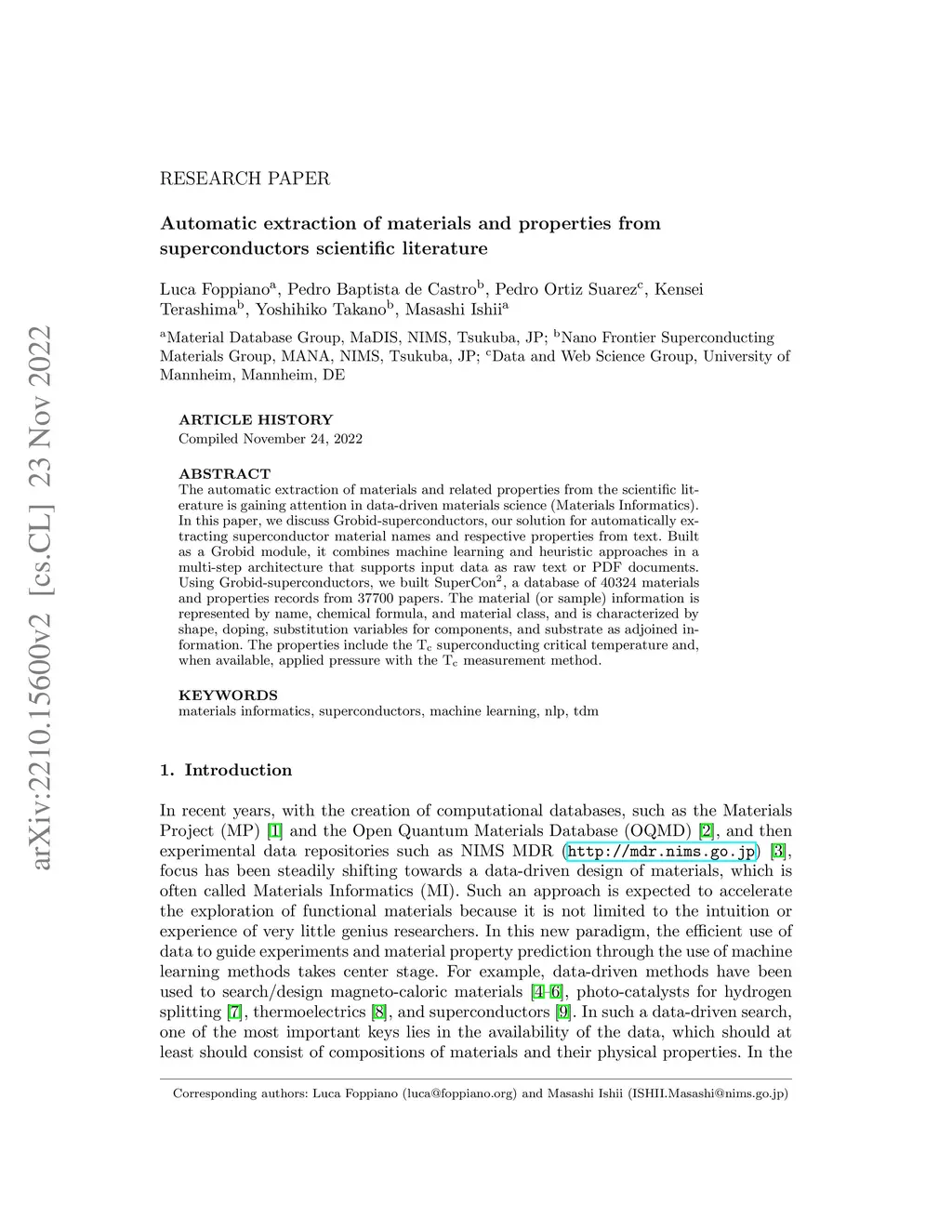 The automatic extraction of materials and related properties from the scientific literature is gaining attention in data-driven materials science (Materials Informatics). In this paper, we discuss Grobid-superconductors, our solution for automatically extracting superconductor material names and respective properties from text. Built as a Grobid module, it combines machine learning and heuristic approaches in a multi-step architecture that supports input data as raw text or PDF documents. Using Grobid-superconductors, we built SuperCon2, a database of 40324 materials and properties records from 37700 papers. The material (or sample) information is represented by name, chemical formula, and material class, and is characterized by shape, doping, substitution variables for components, and substrate as adjoined information. The properties include the Tc superconducting critical temperature and, when available, applied pressure with the Tc measurement method.