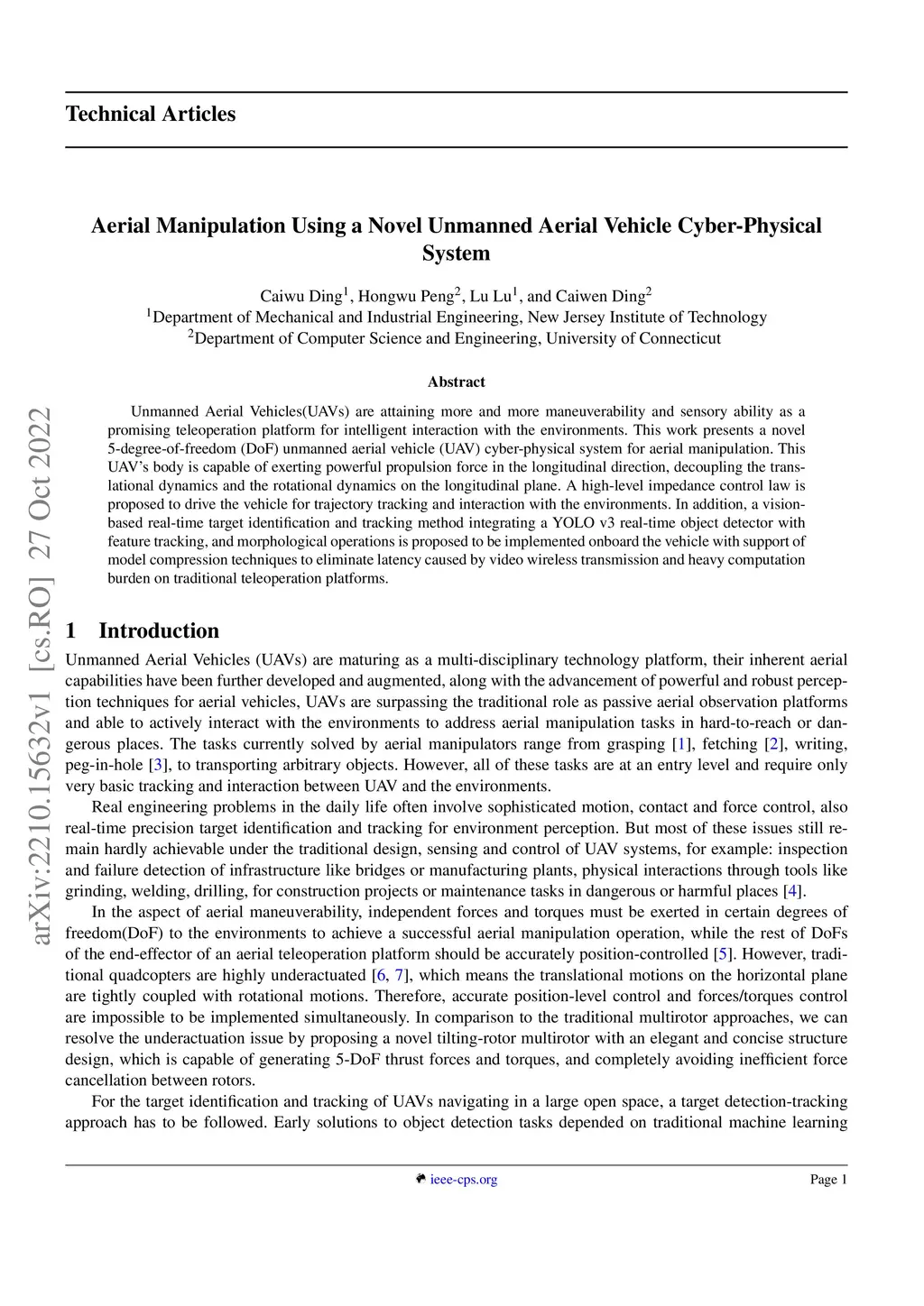 Unmanned Aerial Vehicles(UAVs) are attaining more and more maneuverability and sensory ability as a promising teleoperation platform for intelligent interaction with the environments. This work presents a novel 5-degree-of-freedom (DoF) unmanned aerial vehicle (UAV) cyber-physical system for aerial manipulation. This UAV's body is capable of exerting powerful propulsion force in the longitudinal direction, decoupling the translational dynamics and the rotational dynamics on the longitudinal plane. A high-level impedance control law is proposed to drive the vehicle for trajectory tracking and interaction with the environments. In addition, a vision-based real-time target identification and tracking method integrating a YOLO v3 real-time object detector with feature tracking, and morphological operations is proposed to be implemented onboard the vehicle with support of model compression techniques to eliminate latency caused by video wireless transmission and heavy computation burden on traditional teleoperation platforms.