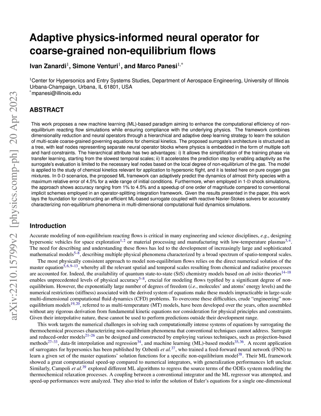 This work proposes a new machine learning (ML)-based paradigm aiming to enhance the computational efficiency of non-equilibrium reacting flow simulations while ensuring compliance with the underlying physics. The framework combines dimensionality reduction and neural operators through a hierarchical and adaptive deep learning strategy to learn the solution of multi-scale coarse-grained governing equations for chemical kinetics. The proposed surrogate's architecture is structured as a tree, with leaf nodes representing separate neural operator blocks where physics is embedded in the form of multiple soft and hard constraints. The hierarchical attribute has two advantages: i) It allows the simplification of the training phase via transfer learning, starting from the slowest temporal scales; ii) It accelerates the prediction step by enabling adaptivity as the surrogate's evaluation is limited to the necessary leaf nodes based on the local degree of non-equilibrium of the gas. The model is applied to the study of chemical kinetics relevant for application to hypersonic flight, and it is tested here on pure oxygen gas mixtures. In 0-D scenarios, the proposed ML framework can adaptively predict the dynamics of almost thirty species with a maximum relative error of 4.5% for a wide range of initial conditions. Furthermore, when employed in 1-D shock simulations, the approach shows accuracy ranging from 1% to 4.5% and a speedup of one order of magnitude compared to conventional implicit schemes employed in an operator-splitting integration framework. Given the results presented in the paper, this work lays the foundation for constructing an efficient ML-based surrogate coupled with reactive Navier-Stokes solvers for accurately characterizing non-equilibrium phenomena in multi-dimensional computational fluid dynamics simulations.