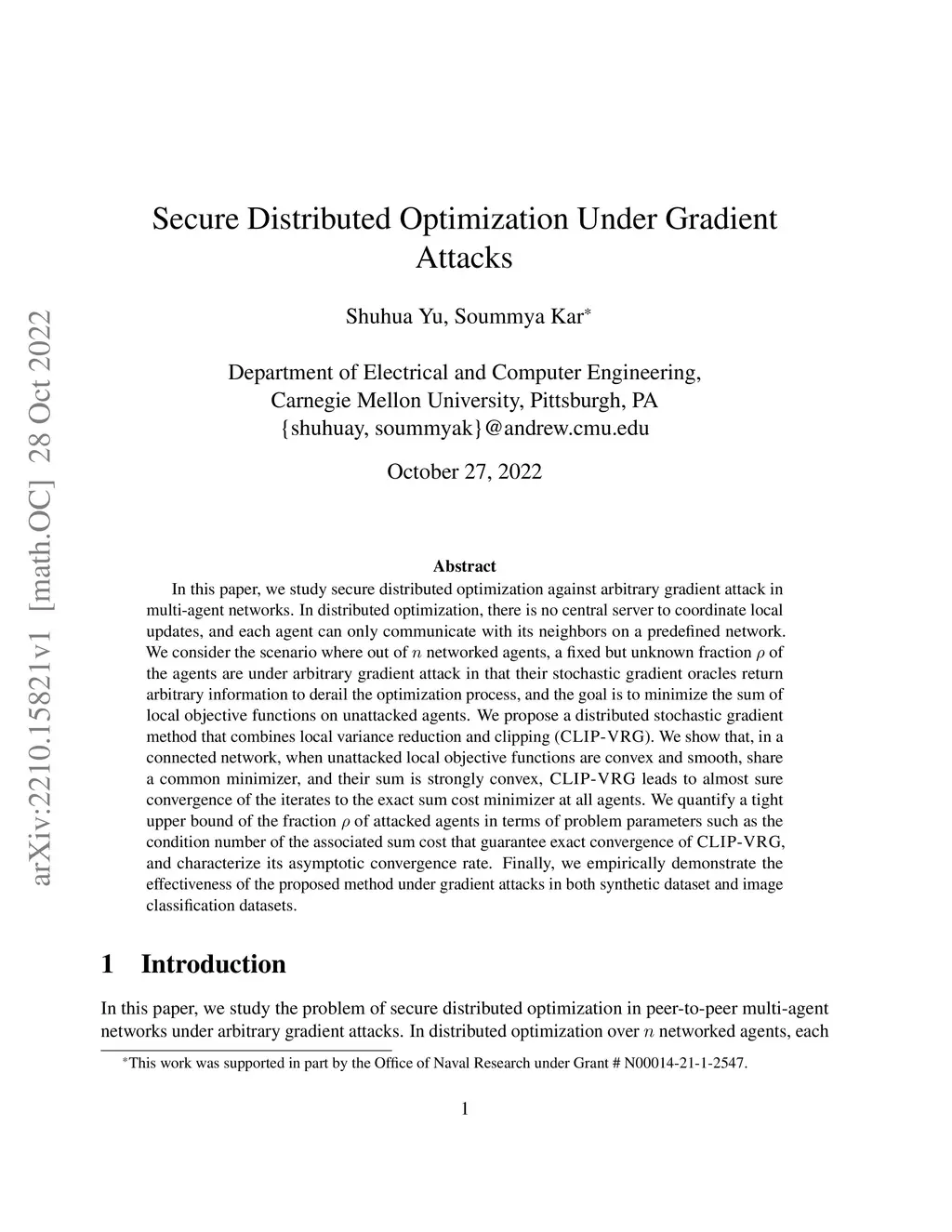 In this paper, we study secure distributed optimization against arbitrary gradient attack in multi-agent networks. In distributed optimization, there is no central server to coordinate local updates, and each agent can only communicate with its neighbors on a predefined network. We consider the scenario where out of networked agents, a fixed but unknown fraction of the agents are under arbitrary gradient attack in that their stochastic gradient oracles return arbitrary information to derail the optimization process, and the goal is to minimize the sum of local objective functions on unattacked agents. We propose a distributed stochastic gradient method that combines local variance reduction and clipping (CLIP-VRG). We show that, in a connected network, when unattacked local objective functions are convex and smooth, share a common minimizer, and their sum is strongly convex, CLIP-VRG leads to almost sure convergence of the iterates to the exact sum cost minimizer at all agents. We quantify a tight upper bound of the fraction of attacked agents in terms of problem parameters such as the condition number of the associated sum cost that guarantee exact convergence of CLIP-VRG, and characterize its asymptotic convergence rate. Finally, we empirically demonstrate the effectiveness of the proposed method under gradient attacks in both synthetic dataset and image classification datasets.