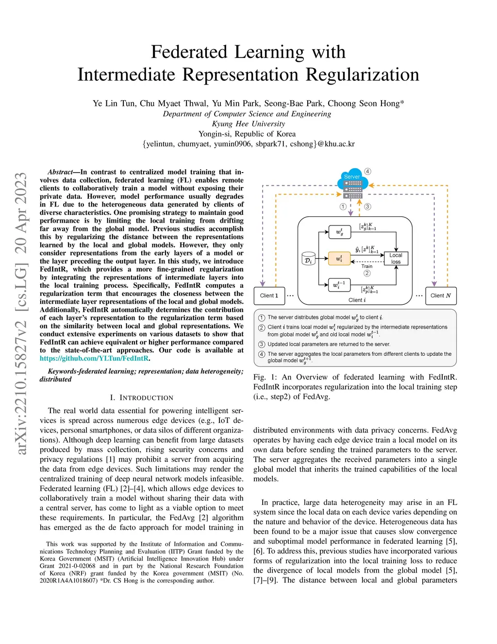 In contrast to centralized model training that involves data collection, federated learning (FL) enables remote clients to collaboratively train a model without exposing their private data. However, model performance usually degrades in FL due to the heterogeneous data generated by clients of diverse characteristics. One promising strategy to maintain good performance is by limiting the local training from drifting far away from the global model. Previous studies accomplish this by regularizing the distance between the representations learned by the local and global models. However, they only consider representations from the early layers of a model or the layer preceding the output layer. In this study, we introduce FedIntR, which provides a more fine-grained regularization by integrating the representations of intermediate layers into the local training process. Specifically, FedIntR computes a regularization term that encourages the closeness between the intermediate layer representations of the local and global models. Additionally, FedIntR automatically determines the contribution of each layer's representation to the regularization term based on the similarity between local and global representations. We conduct extensive experiments on various datasets to show that FedIntR can achieve equivalent or higher performance compared to the state-of-the-art approaches. Our code is available at https://github.com/YLTun/FedIntR.