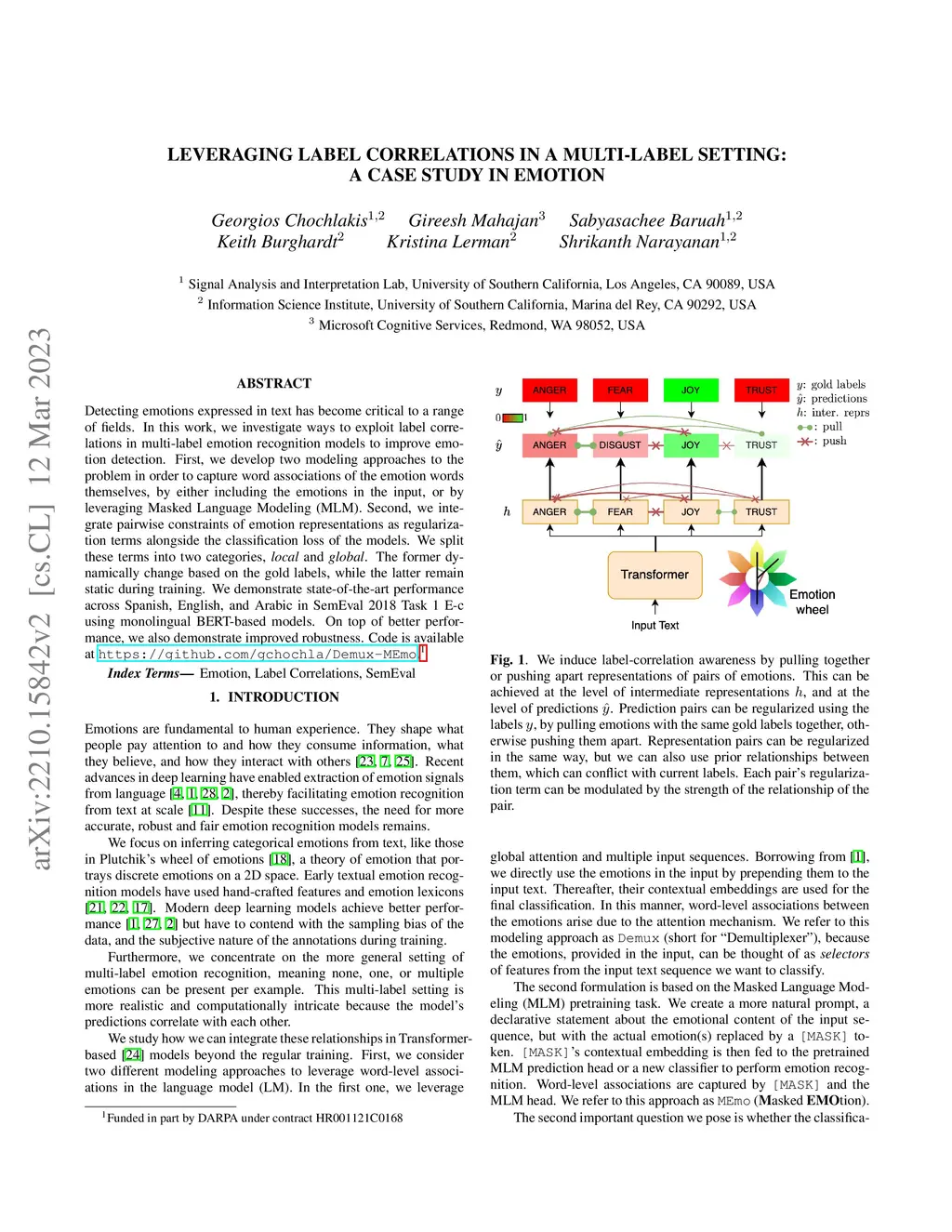 Detecting emotions expressed in text has become critical to a range of fields. In this work, we investigate ways to exploit label correlations in multi-label emotion recognition models to improve emotion detection. First, we develop two modeling approaches to the problem in order to capture word associations of the emotion words themselves, by either including the emotions in the input, or by leveraging Masked Language Modeling (MLM). Second, we integrate pairwise constraints of emotion representations as regularization terms alongside the classification loss of the models. We split these terms into two categories, local and global. The former dynamically change based on the gold labels, while the latter remain static during training. We demonstrate state-of-the-art performance across Spanish, English, and Arabic in SemEval 2018 Task 1 E-c using monolingual BERT-based models. On top of better performance, we also demonstrate improved robustness. Code is available at https://github.com/gchochla/Demux-MEmo.