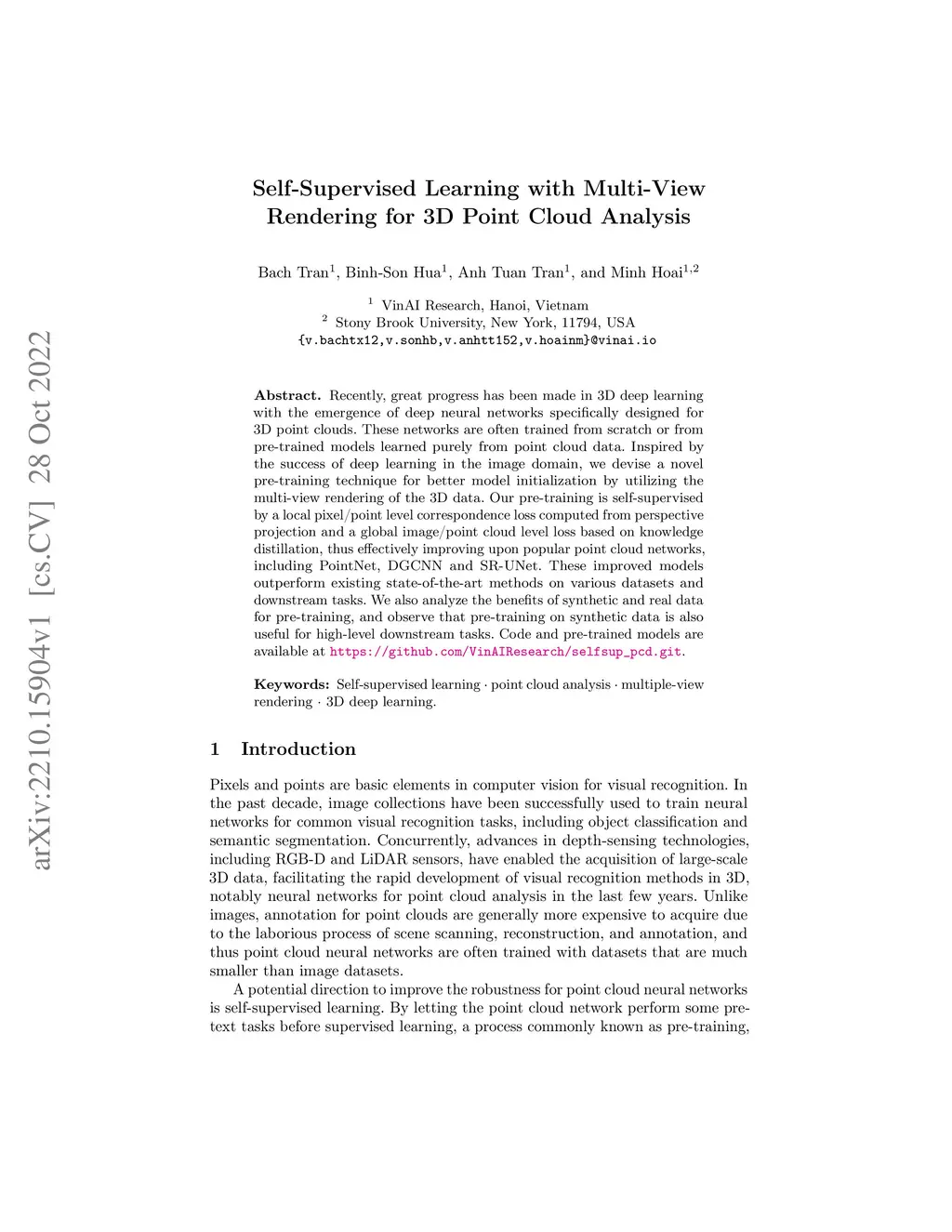 Self-Supervised Learning with Multi-View Rendering for 3D Point Cloud
