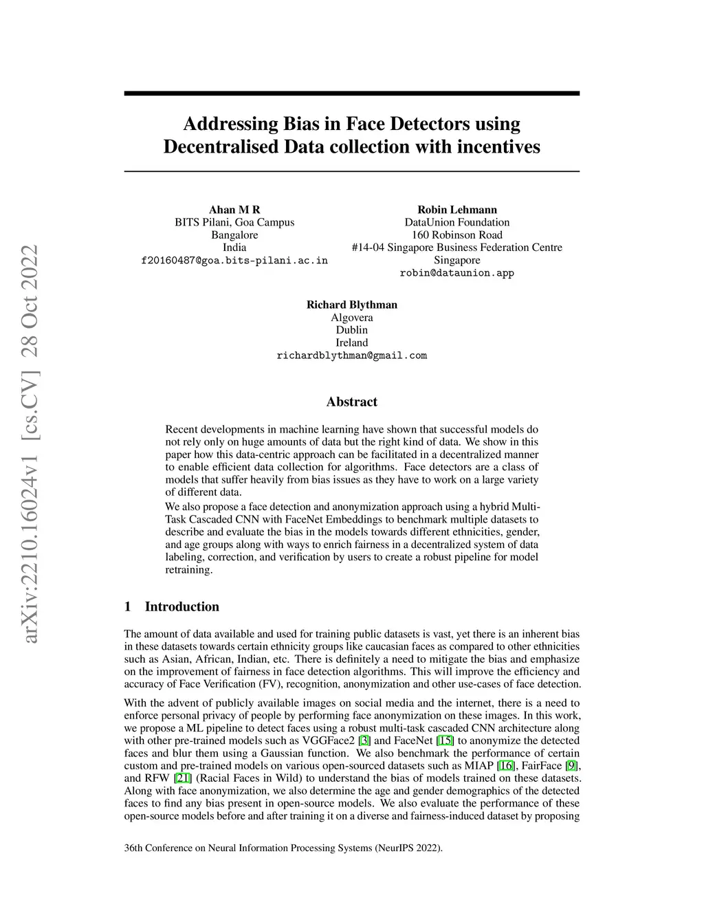 Recent developments in machine learning have shown that successful models do not rely only on huge amounts of data but the right kind of data. We show in this paper how this data-centric approach can be facilitated in a decentralized manner to enable efficient data collection for algorithms. Face detectors are a class of models that suffer heavily from bias issues as they have to work on a large variety of different data. We also propose a face detection and anonymization approach using a hybrid MultiTask Cascaded CNN with FaceNet Embeddings to benchmark multiple datasets to describe and evaluate the bias in the models towards different ethnicities, gender, and age groups along with ways to enrich fairness in a decentralized system of data labeling, correction, and verification by users to create a robust pipeline for model retraining.