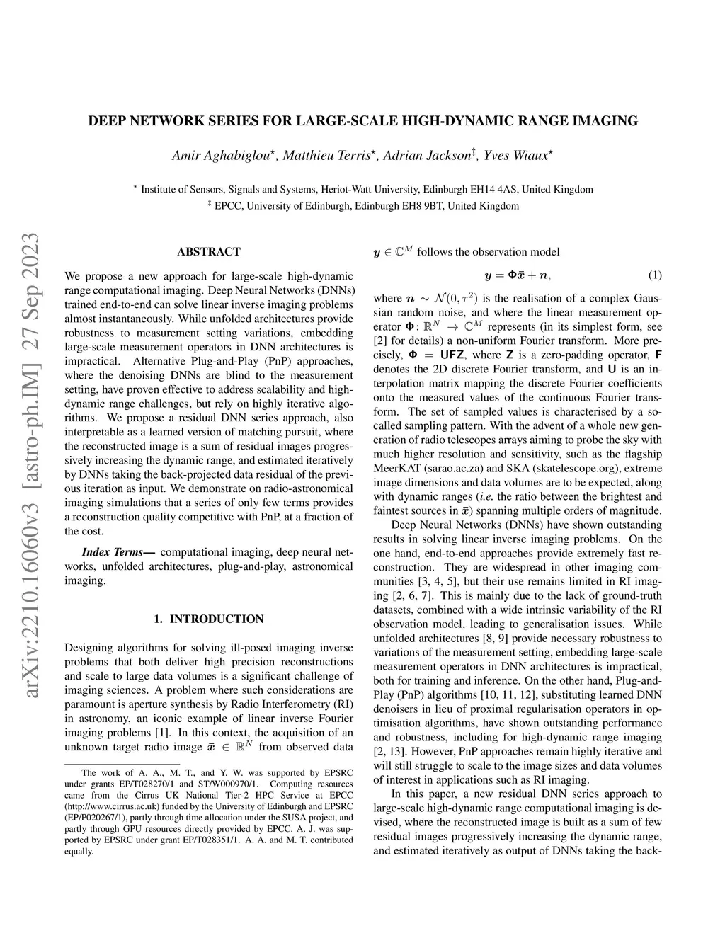 We propose a new approach for large-scale high-dynamic range computational imaging. Deep Neural Networks (DNNs) trained end-to-end can solve linear inverse imaging problems almost instantaneously. While unfolded architectures provide robustness to measurement setting variations, embedding large-scale measurement operators in DNN architectures is impractical. Alternative Plug-and-Play (PnP) approaches, where the denoising DNNs are blind to the measurement setting, have proven effective to address scalability and high-dynamic range challenges, but rely on highly iterative algorithms. We propose a residual DNN series approach, also interpretable as a learned version of matching pursuit, where the reconstructed image is a sum of residual images progressively increasing the dynamic range, and estimated iteratively by DNNs taking the back-projected data residual of the previous iteration as input. We demonstrate on radio-astronomical imaging simulations that a series of only few terms provides a reconstruction quality competitive with PnP, at a fraction of the cost.