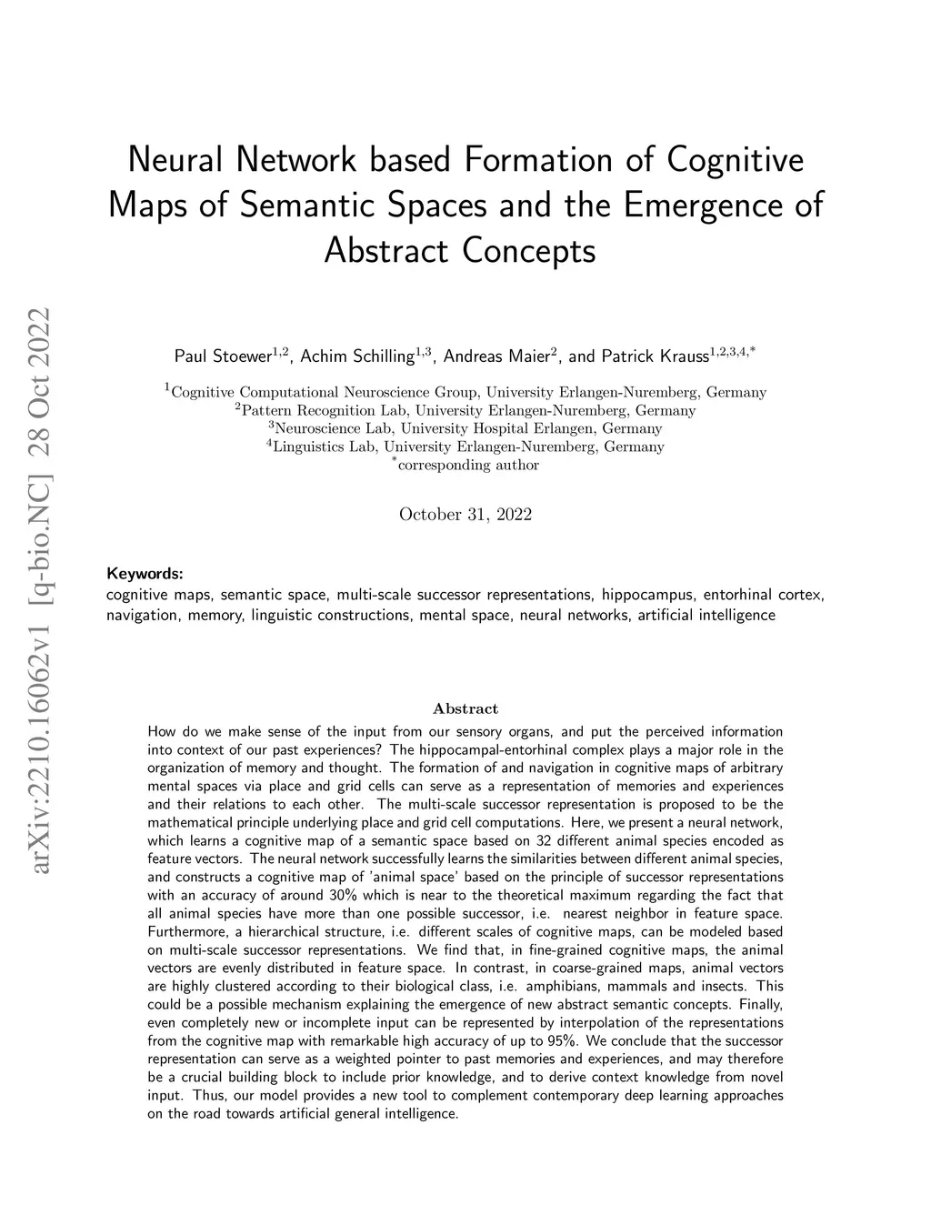 The hippocampal-entorhinal complex plays a major role in the organization of memory and thought. The formation of and navigation in cognitive maps of arbitrary mental spaces via place and grid cells can serve as a representation of memories and experiences and their relations to each other. The multi-scale successor representation is proposed to be the mathematical principle underlying place and grid cell computations. Here, we present a neural network, which learns a cognitive map of a semantic space based on 32 different animal species encoded as feature vectors. The neural network successfully learns the similarities between different animal species, and constructs a cognitive map of ánimal space' based on the principle of successor representations with an accuracy of around 30% which is near to the theoretical maximum regarding the fact that all animal species have more than one possible successor, i.e. nearest neighbor in feature space. Furthermore, a hierarchical structure, i.e. different scales of cognitive maps, can be modeled based on multi-scale successor representations. We find that, in fine-grained cognitive maps, the animal vectors are evenly distributed in feature space. In contrast, in coarse-grained maps, animal vectors are highly clustered according to their biological class, i.e. amphibians, mammals and insects. This could be a possible mechanism explaining the emergence of new abstract semantic concepts. Finally, even completely new or incomplete input can be represented by interpolation of the representations from the cognitive map with remarkable high accuracy of up to 95%. We conclude that the successor representation can serve as a weighted pointer to past memories and experiences, and may therefore be a crucial building block for future machine learning to include prior knowledge, and to derive context knowledge from novel input.
