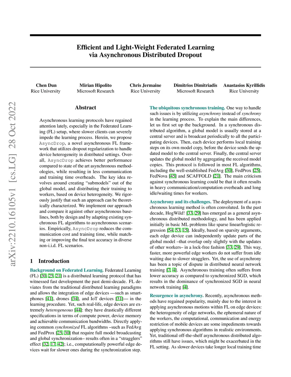 Asynchronous learning protocols have regained attention lately, especially in the Federated Learning (FL) setup, where slower clients can severely impede the learning process. Herein, we propose \texttt{AsyncDrop}, a novel asynchronous FL framework that utilizes dropout regularization to handle device heterogeneity in distributed settings. Overall, \texttt{AsyncDrop} achieves better performance compared to state of the art asynchronous methodologies, while resulting in less communication and training time overheads. The key idea revolves around creating ``submodels'' out of the global model, and distributing their training to workers, based on device heterogeneity. We rigorously justify that such an approach can be theoretically characterized. We implement our approach and compare it against other asynchronous baselines, both by design and by adapting existing synchronous FL algorithms to asynchronous scenarios. Empirically, \texttt{AsyncDrop} reduces the communication cost and training time, while matching or improving the final test accuracy in diverse non-i.i.d. FL scenarios.