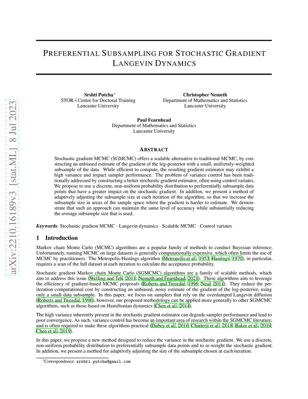 Stochastic gradient MCMC (SGMCMC) offers a scalable alternative to traditional MCMC, by constructing an unbiased estimate of the gradient of the log-posterior with a small, uniformly-weighted subsample of the data. While efficient to compute, the resulting gradient estimator may exhibit a high variance and impact sampler performance. The problem of variance control has been traditionally addressed by constructing a better stochastic gradient estimator, often using control variates. We propose to use a discrete, non-uniform probability distribution to preferentially subsample data points that have a greater impact on the stochastic gradient. In addition, we present a method of adaptively adjusting the subsample size at each iteration of the algorithm, so that we increase the subsample size in areas of the sample space where the gradient is harder to estimate. We demonstrate that such an approach can maintain the same level of accuracy while substantially reducing the average subsample size that is used.