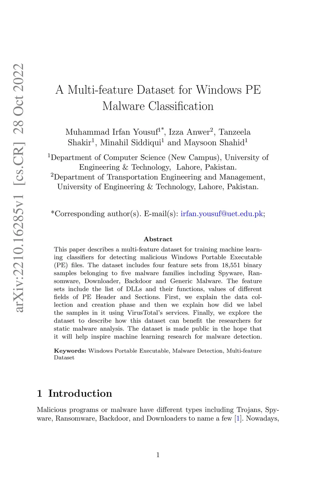 Multi-feature Dataset for Windows PE Malware Classification