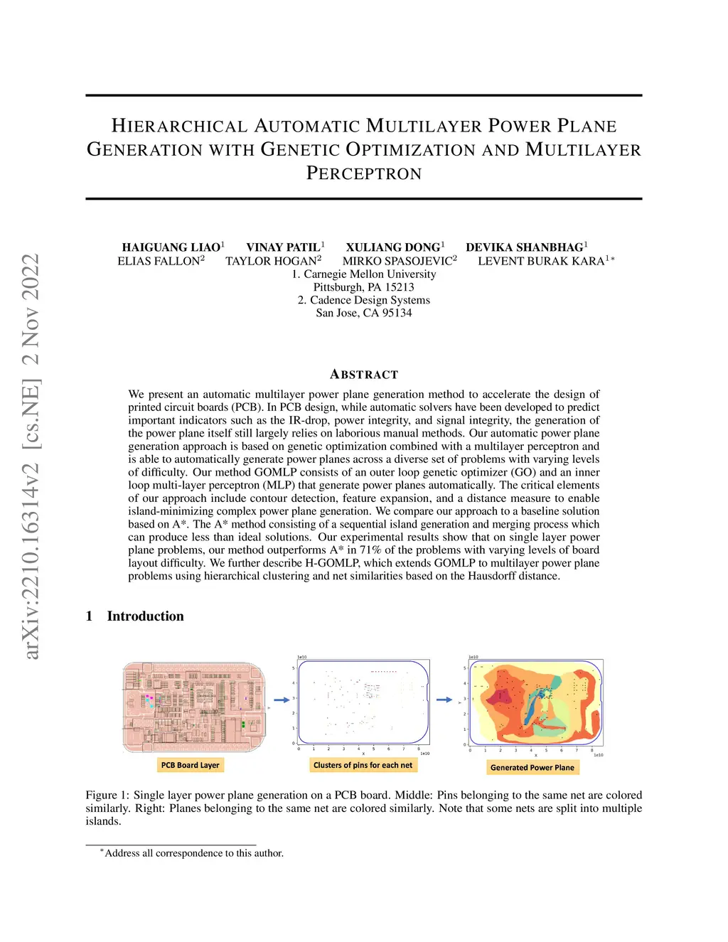 We present an automatic multilayer power plane generation method to accelerate the design of printed circuit boards (PCB). In PCB design, while automatic solvers have been developed to predict important indicators such as the IR-drop, power integrity, and signal integrity, the generation of the power plane itself still largely relies on laborious manual methods. Our automatic power plane generation approach is based on genetic optimization combined with a multilayer perceptron and is able to automatically generate power planes across a diverse set of problems with varying levels of difficulty. Our method GOMLP consists of an outer loop genetic optimizer (GO) and an inner loop multi-layer perceptron (MLP) that generate power planes automatically. The critical elements of our approach include contour detection, feature expansion, and a distance measure to enable island-minimizing complex power plane generation. We compare our approach to a baseline solution based on A*. The A* method consisting of a sequential island generation and merging process which can produce less than ideal solutions. Our experimental results show that on single layer power plane problems, our method outperforms A* in 71% of the problems with varying levels of board layout difficulty. We further describe H-GOMLP, which extends GOMLP to multilayer power plane problems using hierarchical clustering and net similarities based on the Hausdorff distance.