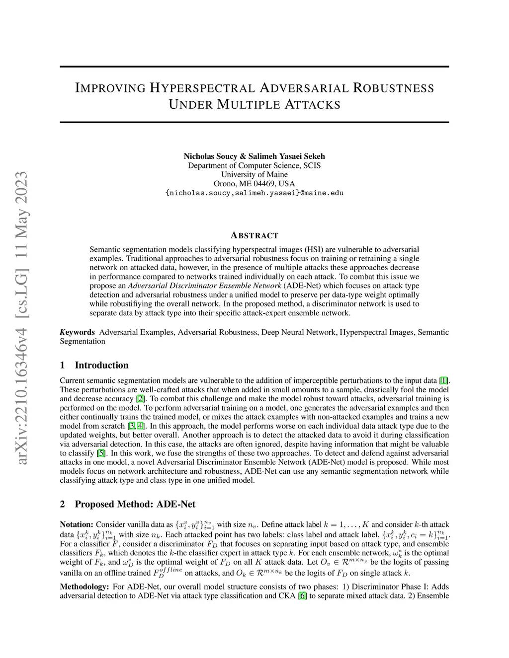 Semantic segmentation models classifying hyperspectral images (HSI) are vulnerable to adversarial examples. Traditional approaches to adversarial robustness focus on training or retraining a single network on attacked data, however, in the presence of multiple attacks these approaches decrease in performance compared to networks trained individually on each attack. To combat this issue we propose an Adversarial Discriminator Ensemble Network (ADE-Net) which focuses on attack type detection and adversarial robustness under a unified model to preserve per data-type weight optimally while robustifiying the overall network. In the proposed method, a discriminator network is used to separate data by attack type into their specific attack-expert ensemble network.