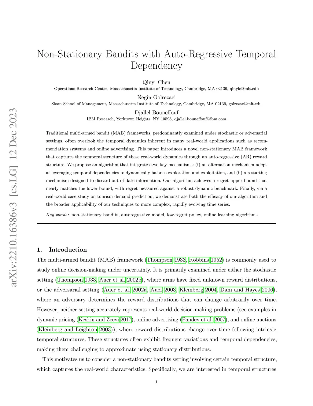Traditional multi-armed bandit (MAB) frameworks, predominantly examined under stochastic or adversarial settings, often overlook the temporal dynamics inherent in many real-world applications such as recommendation systems and online advertising. This paper introduces a novel non-stationary MAB framework that captures the temporal structure of these real-world dynamics through an auto-regressive (AR) reward structure. We propose an algorithm that integrates two key mechanisms: (i) an alternation mechanism adept at leveraging temporal dependencies to dynamically balance exploration and exploitation, and (ii) a restarting mechanism designed to discard out-of-date information. Our algorithm achieves a regret upper bound that nearly matches the lower bound, with regret measured against a robust dynamic benchmark. Finally, via a real-world case study on tourism demand prediction, we demonstrate both the efficacy of our algorithm and the broader applicability of our techniques to more complex, rapidly evolving time series.