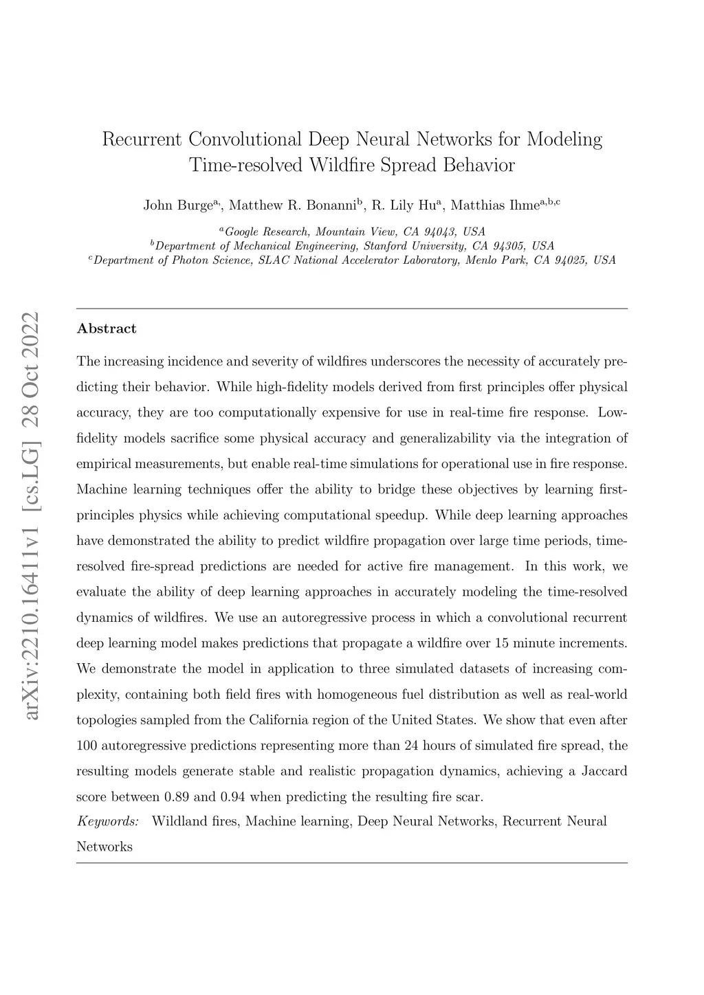 The increasing incidence and severity of wildfires underscores the necessity of accurately predicting their behavior. While high-fidelity models derived from first principles offer physical accuracy, they are too computationally expensive for use in real-time fire response. Low-fidelity models sacrifice some physical accuracy and generalizability via the integration of empirical measurements, but enable real-time simulations for operational use in fire response. Machine learning techniques offer the ability to bridge these objectives by learning first-principles physics while achieving computational speedup. While deep learning approaches have demonstrated the ability to predict wildfire propagation over large time periods, time-resolved fire-spread predictions are needed for active fire management. In this work, we evaluate the ability of deep learning approaches in accurately modeling the time-resolved dynamics of wildfires. We use an autoregressive process in which a convolutional recurrent deep learning model makes predictions that propagate a wildfire over 15 minute increments. We demonstrate the model in application to three simulated datasets of increasing complexity, containing both field fires with homogeneous fuel distribution as well as real-world topologies sampled from the California region of the United States. We show that even after 100 autoregressive predictions representing more than 24 hours of simulated fire spread, the resulting models generate stable and realistic propagation dynamics, achieving a Jaccard score between 0.89 and 0.94 when predicting the resulting fire scar.