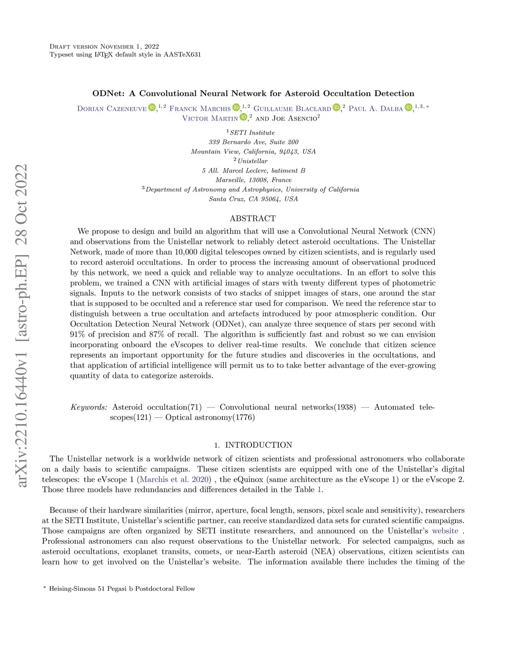 We propose to design and build an algorithm that will use a Convolutional Neural Network (CNN) and observations from the Unistellar network to reliably detect asteroid occultations. The Unistellar Network, made of more than 10,000 digital telescopes owned by citizen scientists, and is regularly used to record asteroid occultations. In order to process the increasing amount of observational produced by this network, we need a quick and reliable way to analyze occultations. In an effort to solve this problem, we trained a CNN with artificial images of stars with twenty different types of photometric signals. Inputs to the network consists of two stacks of snippet images of stars, one around the star that is supposed to be occulted and a reference star used for comparison. We need the reference star to distinguish between a true occultation and artefacts introduced by poor atmospheric condition. Our Occultation Detection Neural Network (ODNet), can analyze three sequence of stars per second with 91\% of precision and 87\% of recall. The algorithm is sufficiently fast and robust so we can envision incorporating onboard the eVscopes to deliver real-time results. We conclude that citizen science represents an important opportunity for the future studies and discoveries in the occultations, and that application of artificial intelligence will permit us to to take better advantage of the ever-growing quantity of data to categorize asteroids.