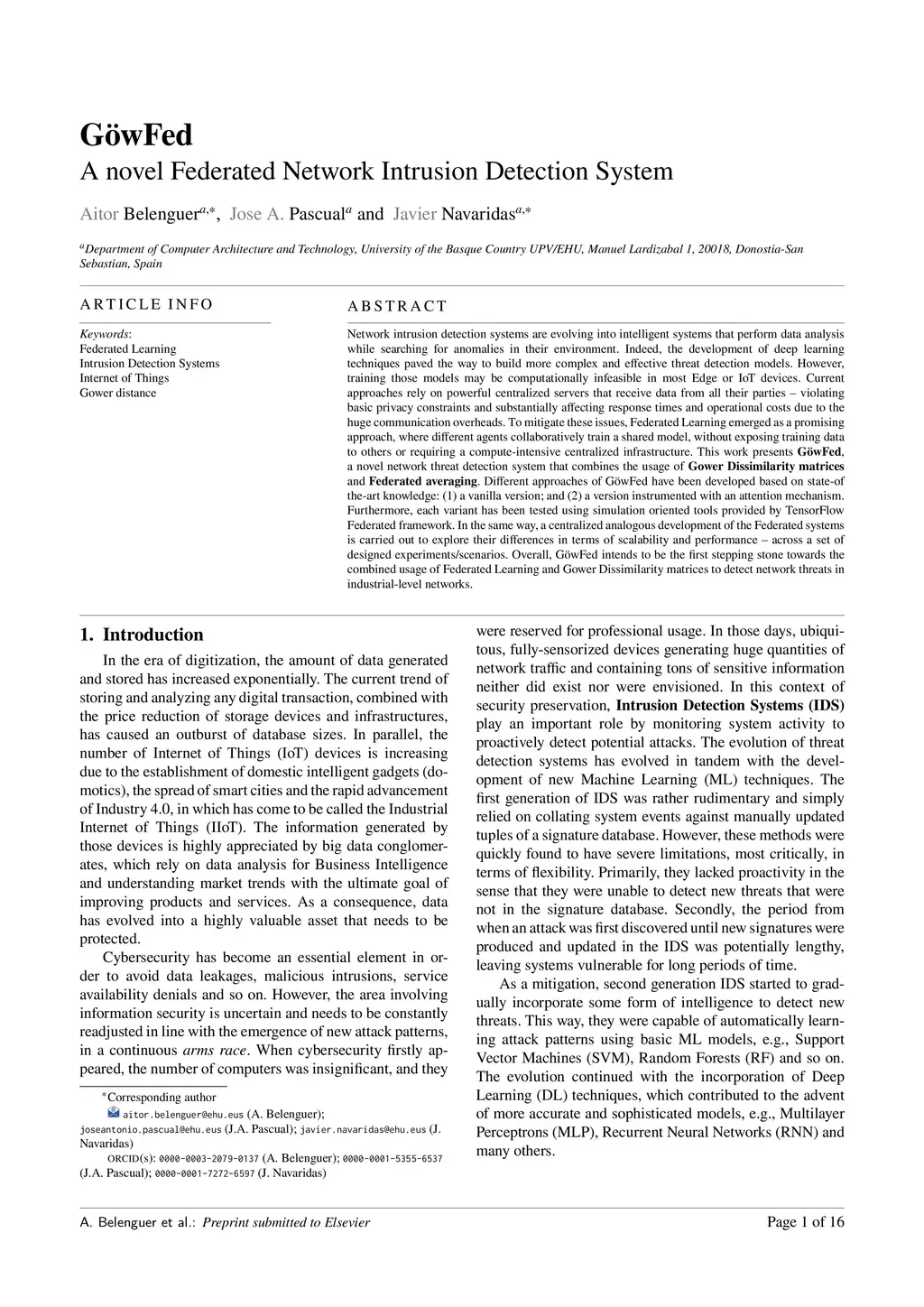 Network intrusion detection systems are evolving into intelligent systems that perform data analysis while searching for anomalies in their environment. Indeed, the development of deep learning techniques paved the way to build more complex and effective threat detection models. However, training those models may be computationally infeasible in most Edge or IoT devices. Current approaches rely on powerful centralized servers that receive data from all their parties - violating basic privacy constraints and substantially affecting response times and operational costs due to the huge communication overheads. To mitigate these issues, Federated Learning emerged as a promising approach, where different agents collaboratively train a shared model, without exposing training data to others or requiring a compute-intensive centralized infrastructure. This work presents GowFed, a novel network threat detection system that combines the usage of Gower Dissimilarity matrices and Federated averaging. Different approaches of GowFed have been developed based on state-of the-art knowledge: (1) a vanilla version; and (2) a version instrumented with an attention mechanism. Furthermore, each variant has been tested using simulation oriented tools provided by TensorFlow Federated framework. In the same way, a centralized analogous development of the Federated systems is carried out to explore their differences in terms of scalability and performance - across a set of designed experiments/scenarios. Overall, GowFed intends to be the first stepping stone towards the combined usage of Federated Learning and Gower Dissimilarity matrices to detect network threats in industrial-level networks.