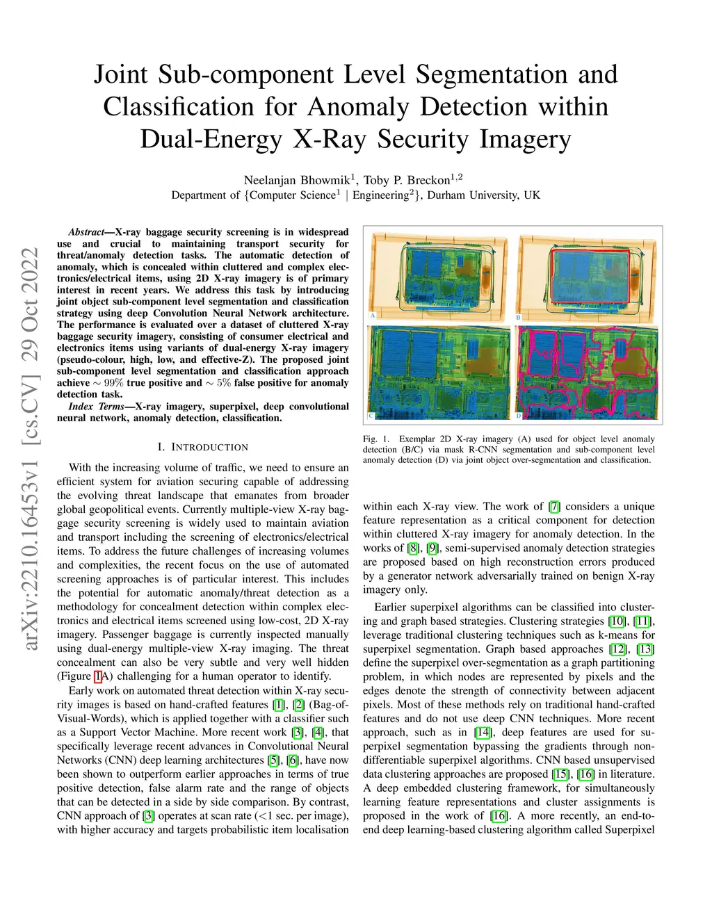 X-ray baggage security screening is in widespread use and crucial to maintaining transport security for threat/anomaly detection tasks. The automatic detection of anomaly, which is concealed within cluttered and complex electronics/electrical items, using 2D X-ray imagery is of primary interest in recent years. We address this task by introducing joint object sub-component level segmentation and classification strategy using deep Convolution Neural Network architecture. The performance is evaluated over a dataset of cluttered X-ray baggage security imagery, consisting of consumer electrical and electronics items using variants of dual-energy X-ray imagery (pseudo-colour, high, low, and effective-Z). The proposed joint sub-component level segmentation and classification approach achieve ~99% true positive and ~5% false positive for anomaly detection task.