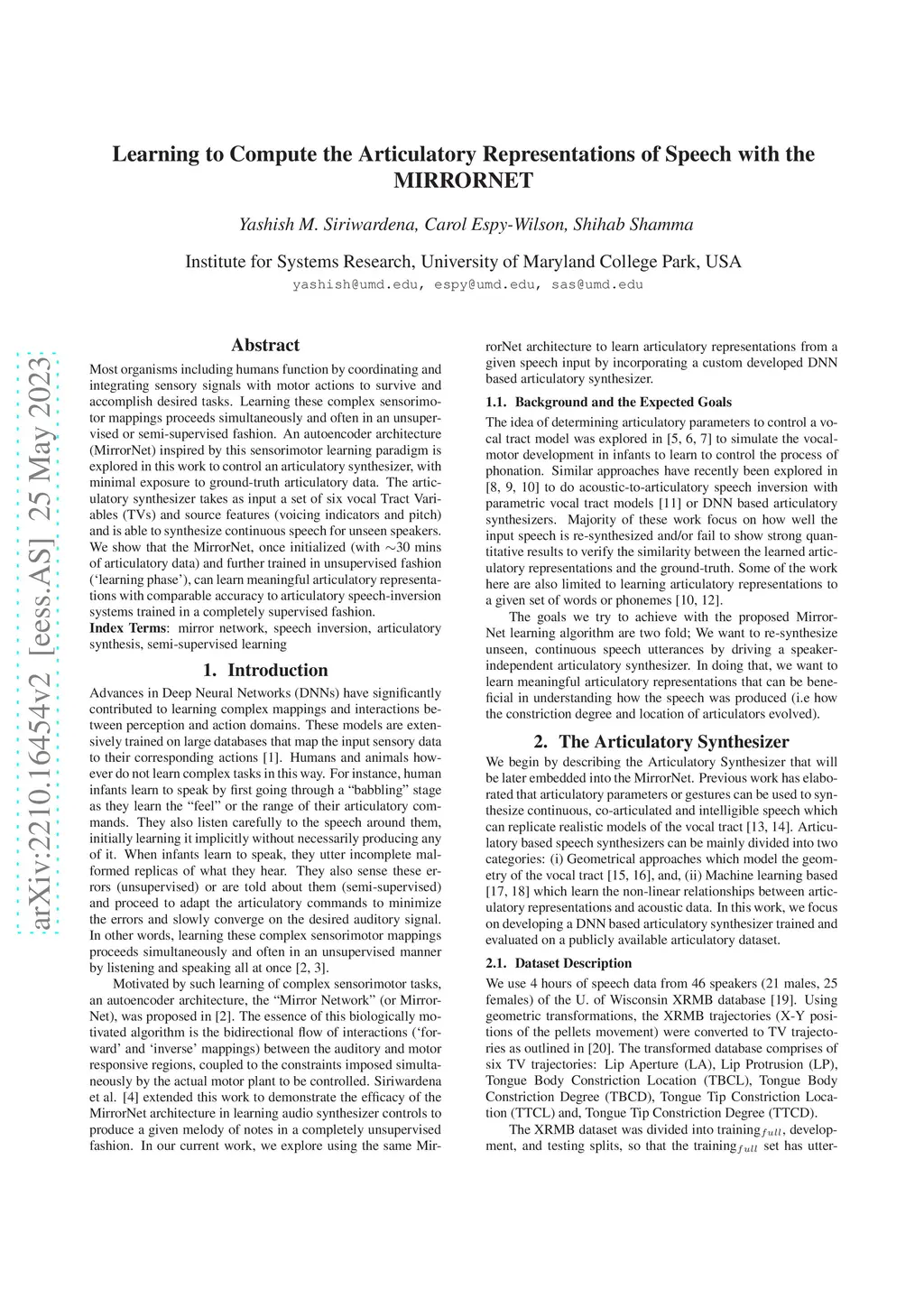 Most organisms including humans function by coordinating and integrating sensory signals with motor actions to survive and accomplish desired tasks. Learning these complex sensorimotor mappings proceeds simultaneously and often in an unsupervised or semi-supervised fashion. An autoencoder architecture (MirrorNet) inspired by this sensorimotor learning paradigm is explored in this work to control an articulatory synthesizer, with minimal exposure to ground-truth articulatory data. The articulatory synthesizer takes as input a set of six vocal Tract Variables (TVs) and source features (voicing indicators and pitch) and is able to synthesize continuous speech for unseen speakers. We show that the MirrorNet, once initialized (with ~30 mins of articulatory data) and further trained in unsupervised fashion (`learning phase'), can learn meaningful articulatory representations with comparable accuracy to articulatory speech-inversion systems trained in a completely supervised fashion.
