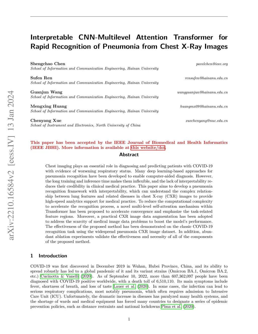Chest imaging plays an essential role in diagnosing and predicting patients with COVID-19 with evidence of worsening respiratory status. Many deep learning-based approaches for pneumonia recognition have been developed to enable computer-aided diagnosis. However, the long training and inference time makes them inflexible, and the lack of interpretability reduces their credibility in clinical medical practice. This paper aims to develop a pneumonia recognition framework with interpretability, which can understand the complex relationship between lung features and related diseases in chest X-ray (CXR) images to provide high-speed analytics support for medical practice. To reduce the computational complexity to accelerate the recognition process, a novel multi-level self-attention mechanism within Transformer has been proposed to accelerate convergence and emphasize the task-related feature regions. Moreover, a practical CXR image data augmentation has been adopted to address the scarcity of medical image data problems to boost the model's performance. The effectiveness of the proposed method has been demonstrated on the classic COVID-19 recognition task using the widespread pneumonia CXR image dataset. In addition, abundant ablation experiments validate the effectiveness and necessity of all of the components of the proposed method.