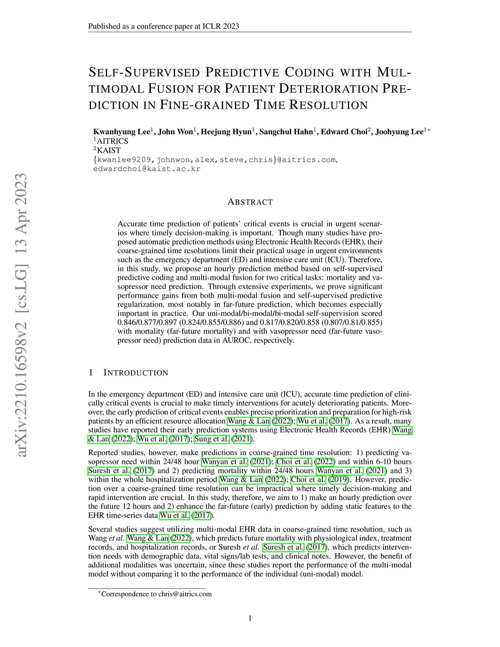 Accurate time prediction of patients' critical events is crucial in urgent scenarios where timely decision-making is important. Though many studies have proposed automatic prediction methods using Electronic Health Records (EHR), their coarse-grained time resolutions limit their practical usage in urgent environments such as the emergency department (ED) and intensive care unit (ICU). Therefore, in this study, we propose an hourly prediction method based on self-supervised predictive coding and multi-modal fusion for two critical tasks: mortality and vasopressor need prediction. Through extensive experiments, we prove significant performance gains from both multi-modal fusion and self-supervised predictive regularization, most notably in far-future prediction, which becomes especially important in practice. Our uni-modal/bi-modal/bi-modal self-supervision scored 0.846/0.877/0.897 (0.824/0.855/0.886) and 0.817/0.820/0.858 (0.807/0.81/0.855) with mortality (far-future mortality) and with vasopressor need (far-future vasopressor need) prediction data in AUROC, respectively.