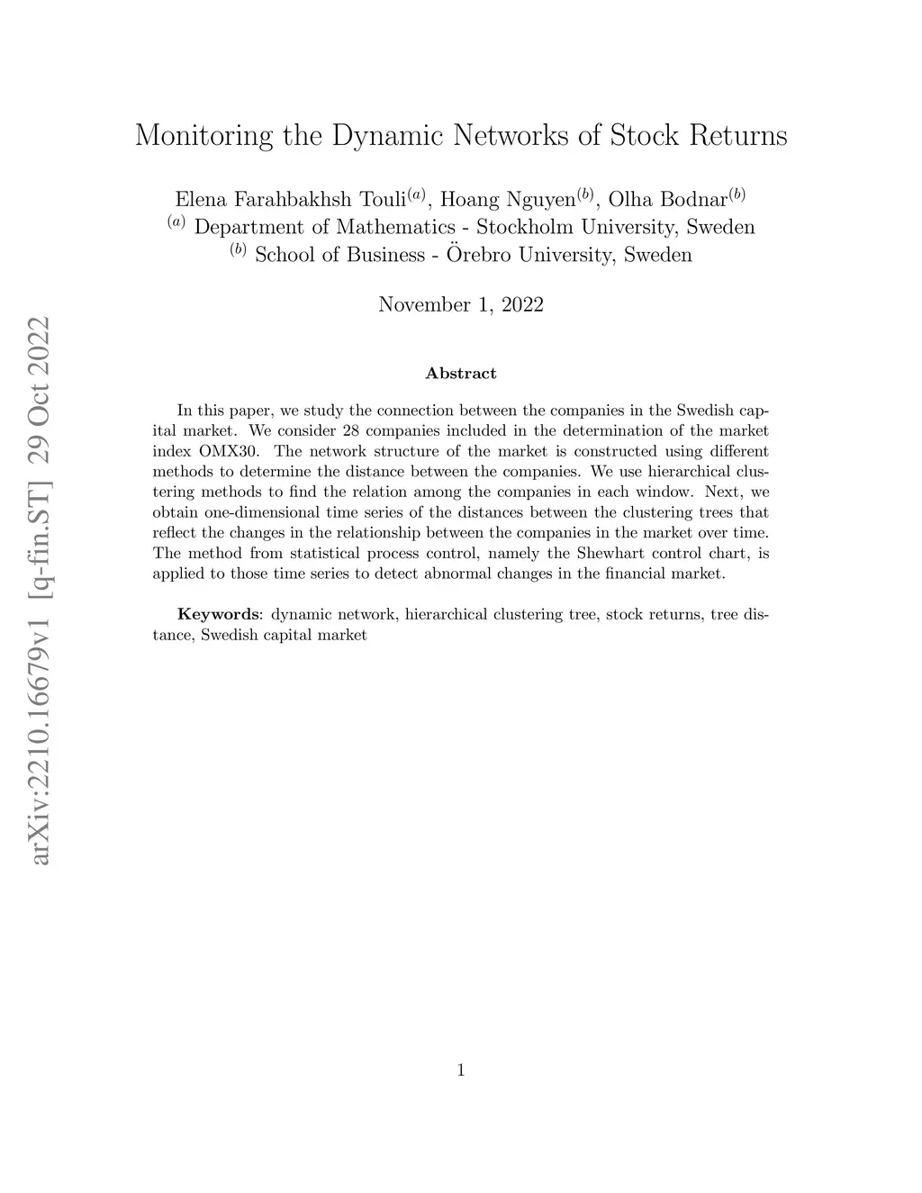 In this paper, we study the connection between the companies in the Swedish capital market. We consider 28 companies included in the determination of the market index OMX30. The network structure of the market is constructed using different methods to determine the distance between the companies. We use hierarchical clustering methods to find the relation among the companies in each window. Next, we obtain one-dimensional time series of the distances between the clustering trees that reflect the changes in the relationship between the companies in the market over time. The method of statistical process control, namely the Shewhart control chart, is applied to those time series to detect abnormal changes in the financial market.
