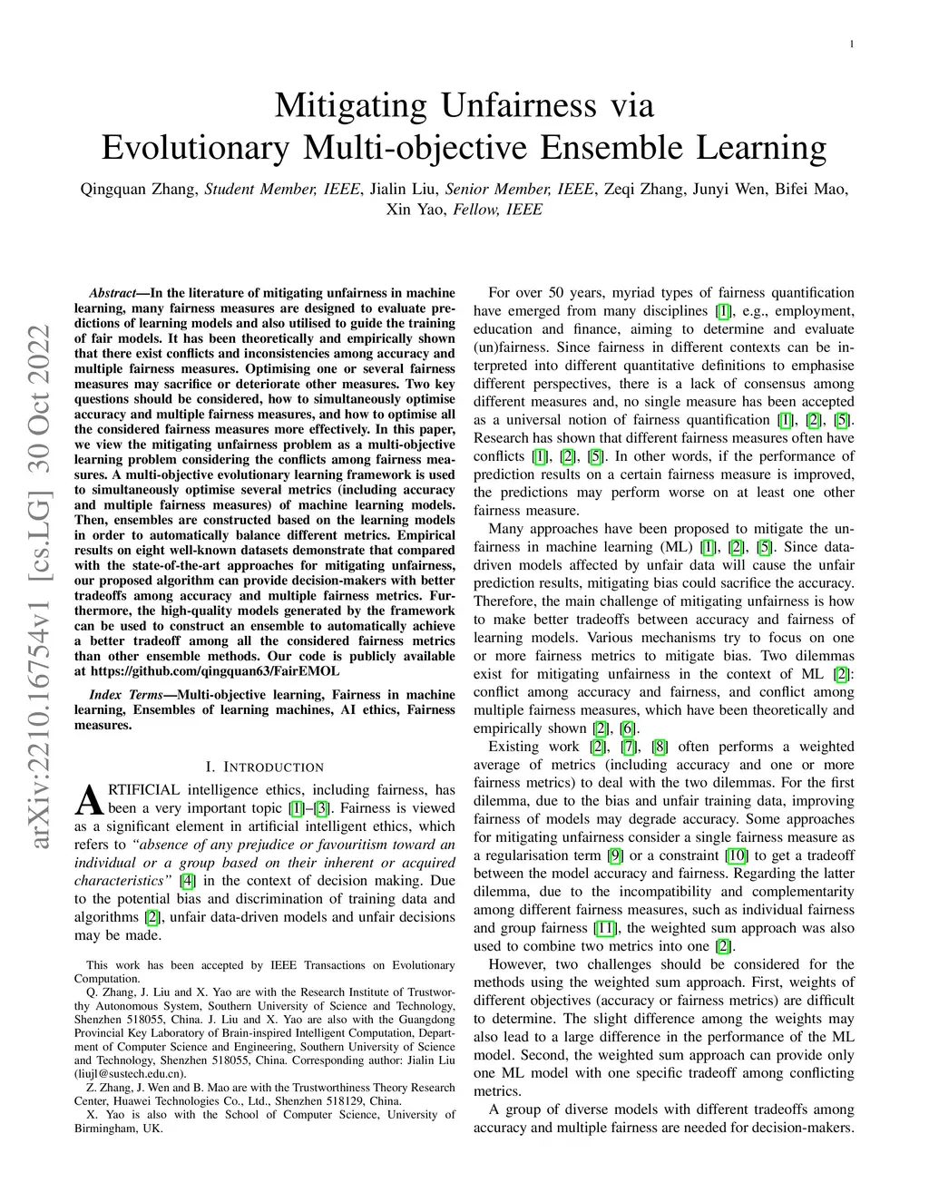 Mitigating Unfairness via Evolutionary Multi-objective Ensemble Learning